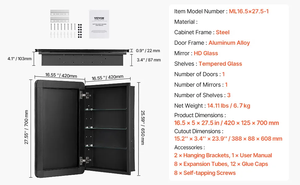 Fit for Various Size: Overall size: 16.5''L x 5''D x 27.5''H; Recessed installation size: 15.2''L x 3.4''D x 23.9''H. Featuring a high-definition mirror, this beveled medicine cabinet creates a bright and expansive atmosphere in your bathroom.