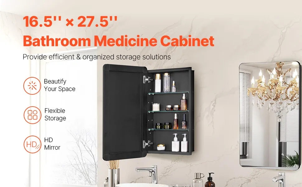 VEVOR Medicine Cabinet, 16.5 x 27.5 inch, Medicine Cabinet for Bathroom with Mirror, Aluminum Frame Bathroom Wall Cabinet, 3-layer Adjustable Shelves, Recessed & Wall-mounted Installation