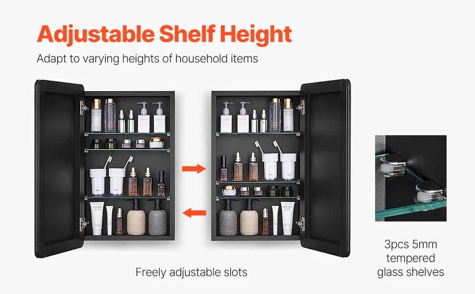 Ample Storage Space: The mirror medicine cabinet comes with 5mm triple-layer adjustable tempered glass, increasing storage capacity while allowing for free, organized divisions. Whether storing small medicine bottles, large shampoo bottles, or various cosmetics, you'll find the ideal spot for everything, eliminating wasted space.