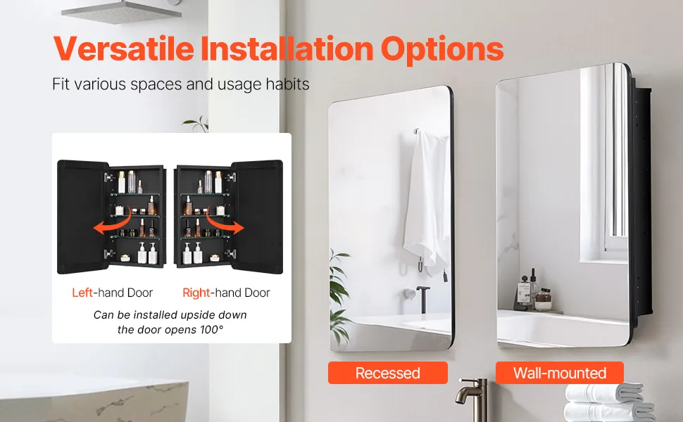 Designed for both wall-mounted and recessed installations, the bathroom vanity mirror cabinet can be flipped to accommodate left or right-hand door openings. It adapts effortlessly to various bathroom layouts, providing added convenience based on your preferences.