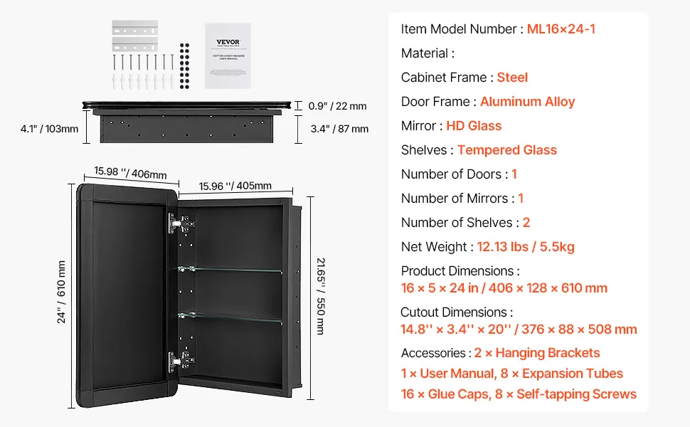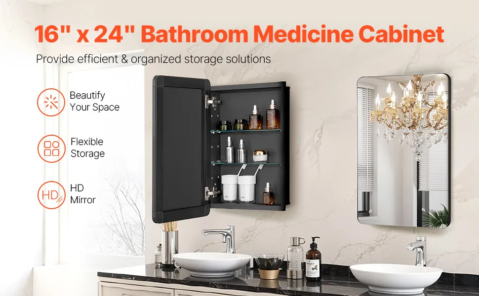 VEVOR Medicine Cabinet, 16 x 24 inch, Medicine Cabinet for Bathroom with Mirror, Aluminum Frame Bathroom Wall Cabinet, 2-layer Adjustable Shelves, Recessed & Wall-mounted Installation