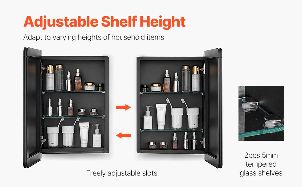 The shelves of mirror medicine cabinet can be easily adjusted up and down, providing personalized storage for items of all sizes—ideal for tall bottles, small cosmetics, and everything in between.