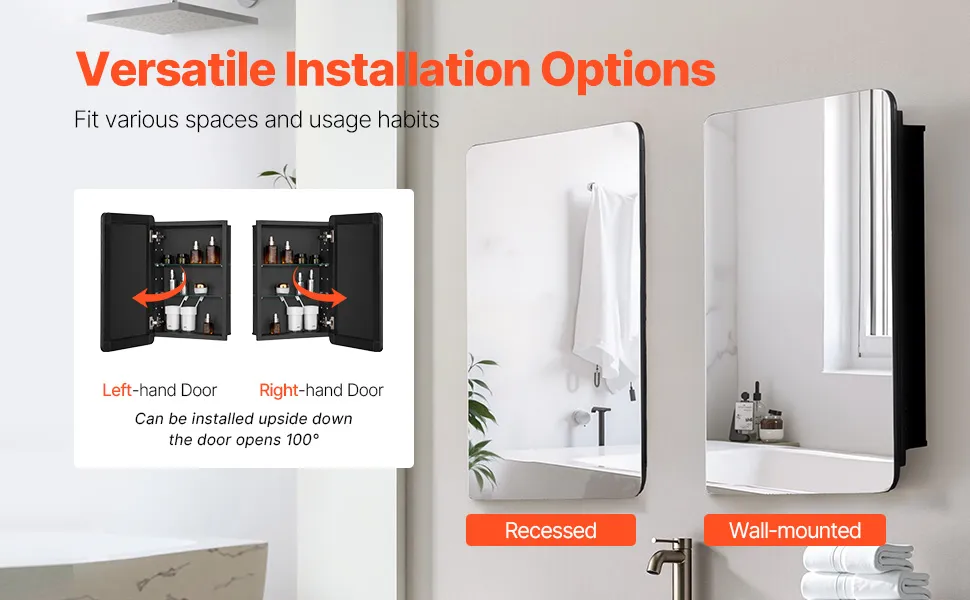 Designed for both wall-mounted and recessed installations, the bathroom vanity mirror cabinet can be flipped to accommodate left or right-hand door openings. It adapts effortlessly to various bathroom layouts, providing added convenience based on your preferences.