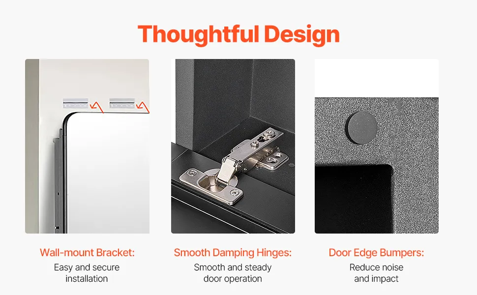 The wall bracket simplifies installation while boosting stability. The medicine cabinet with mirror is equipped with smooth, dampened hinges for quiet door operation, and premium cushioning pads to minimize noise and impact when closing.