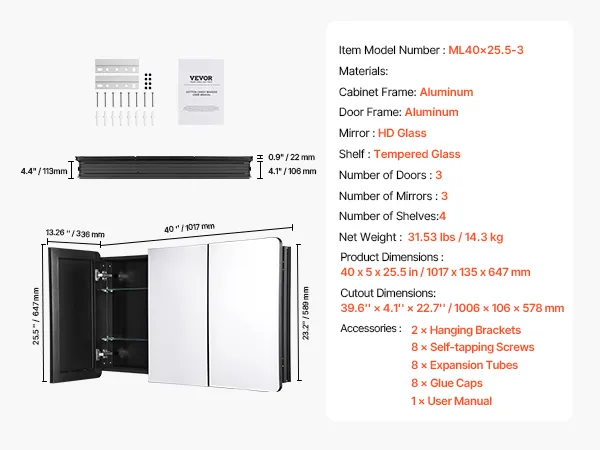 Aesthetic & Durable Materials: The high-quality black aluminum frame and door frame significantly enhance rust resistance, making it ideal for humid environments. With long-lasting durability and no warping over time, the bathroom mirror medicine cabinet ensures reliable performance. The sleek modern design features beveled edges that are secure to touch, providing both style and protection for everyday use.