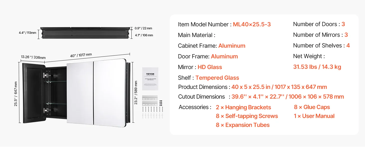 Fit for Various Size: Overall size: 50''L x 5''D x 25.5''H; Recessed installation size: 39.6''L x 4.1''D x 22.7''H. This 3-door, 3-mirror cabinet boasts a full mirror design that looks sleek and sophisticated, enhancing both the brightness and openness of your bathroom. Ideal for 1-3 people to use simultaneously, the beveled medicine cabinet provides a more convenient and shared grooming experience.