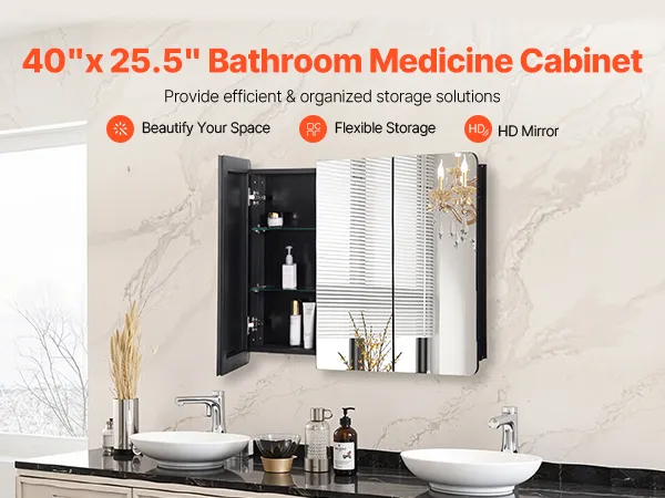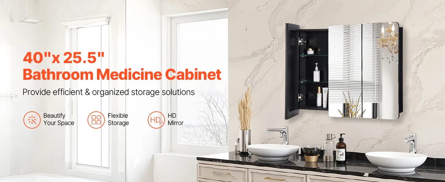VEVOR Medicine Cabinet, 25.5 x 40 inch, Medicine Cabinet for Bathroom with Mirror, Aluminum Frame Bathroom Wall Cabinet, 4-layer Adjustable Shelves, Recessed & Wall-mounted Installation
