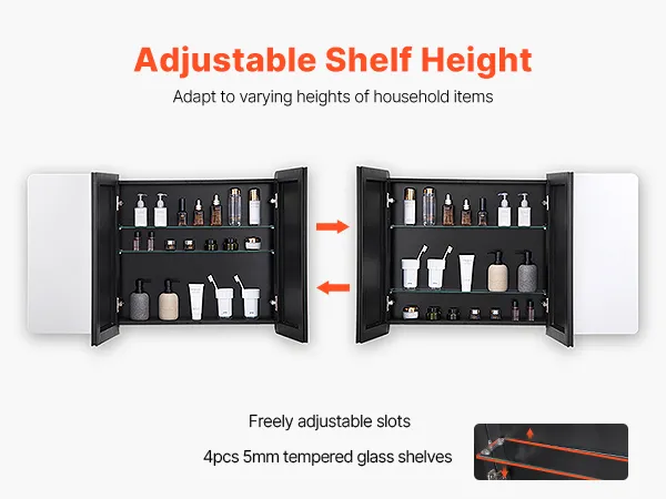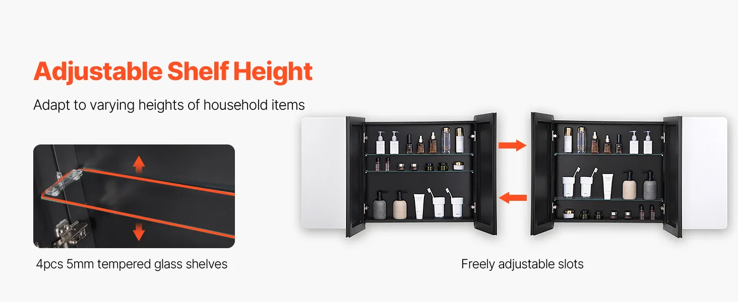 Ample Storage Space: The mirror medicine cabinet includes 5mm quadruple-layer adjustable tempered glass, enhancing storage space with flexible, organized compartments. Whether it’s small bottles, large containers, or cosmetics, everything will have a designated place, optimizing your storage and minimizing waste.