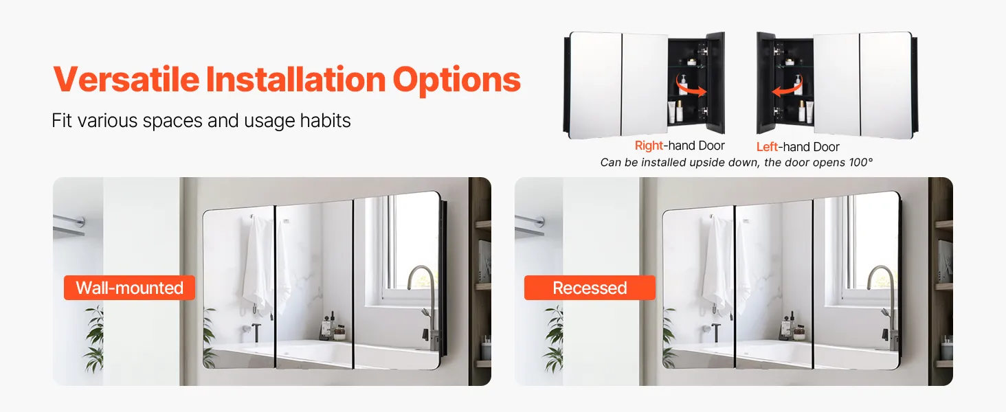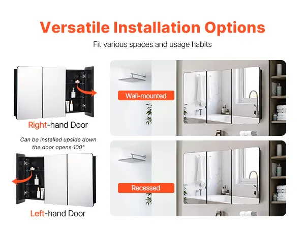 Designed for both wall-mounted and recessed installations, the bathroom vanity mirror cabinet can be flipped to accommodate left or right-hand door openings. It adapts effortlessly to various bathroom layouts, providing added convenience based on your preferences.