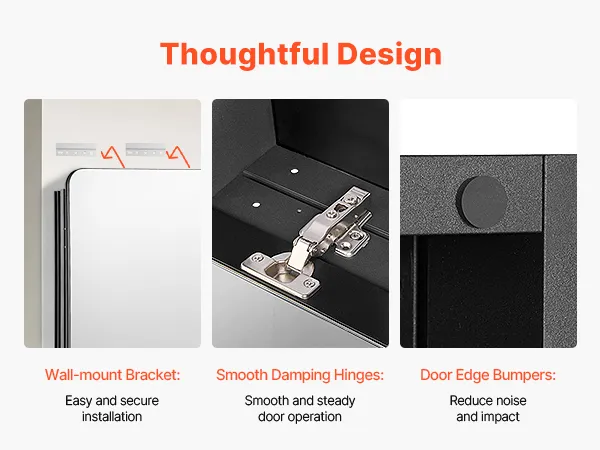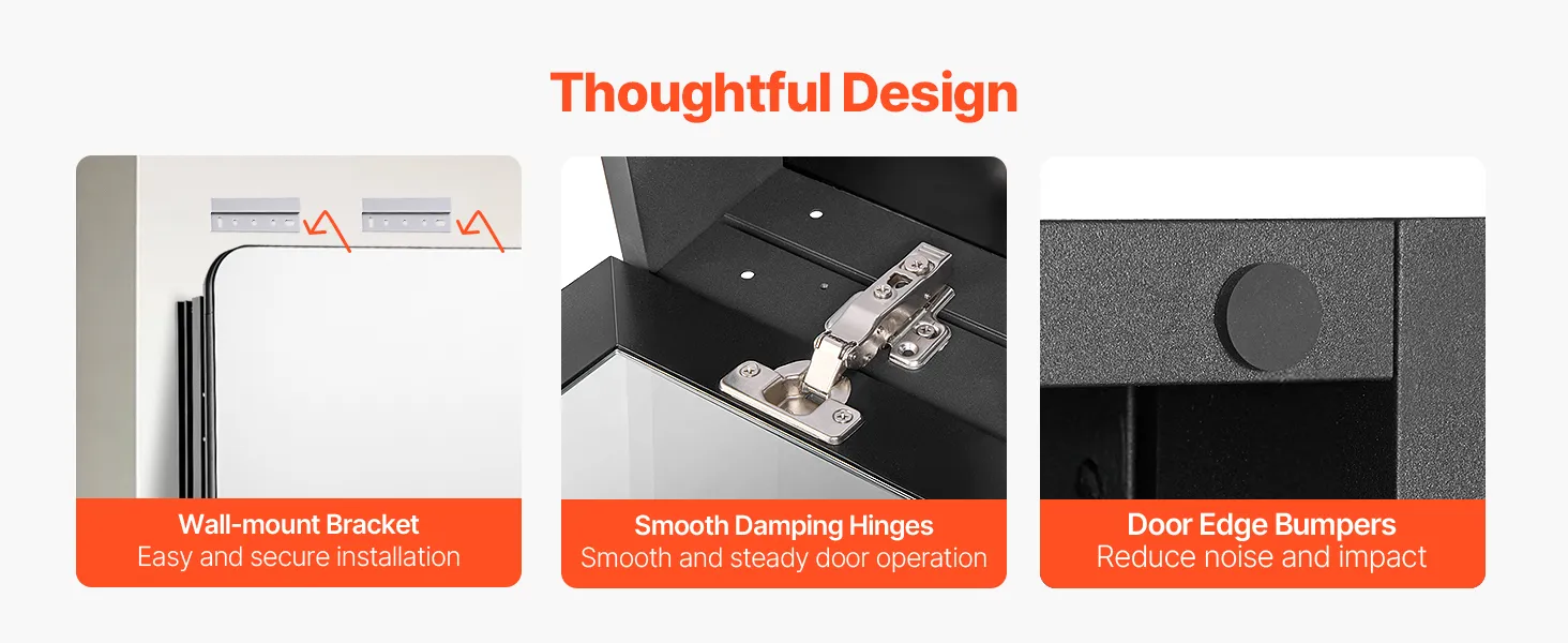The wall bracket simplifies installation while boosting stability. The medicine cabinet with mirror is equipped with smooth, dampened hinges for quiet door operation, and premium cushioning pads to minimize noise and impact when closing.
