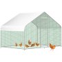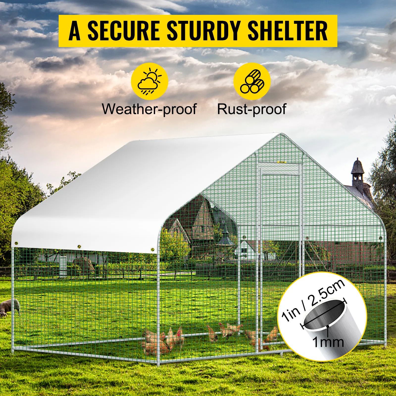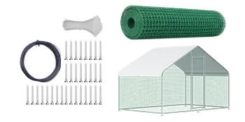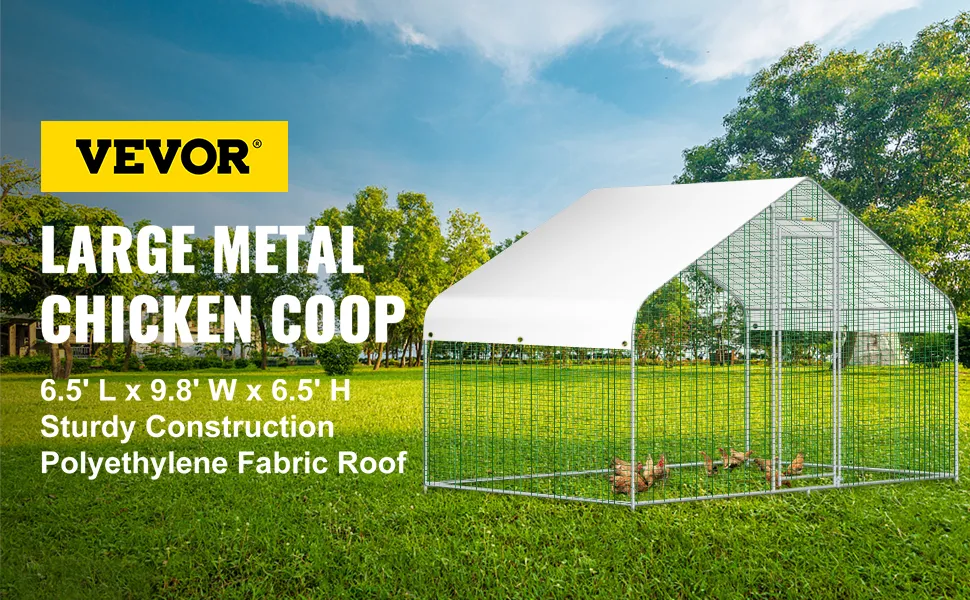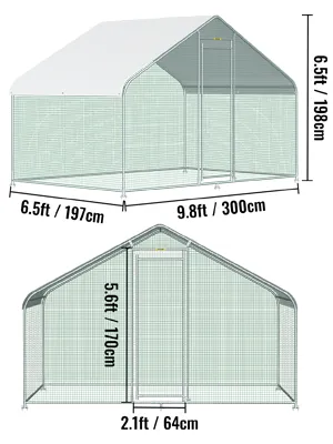 Our 6.5 x 9.8 x 6.5 ft. large metal chicken coop is constructed with a sturdy steel frame, solid enough to keep the poultry from escaping and secure from predators. And this hen run house is also stably stationed to withstand the wind and snow weather.