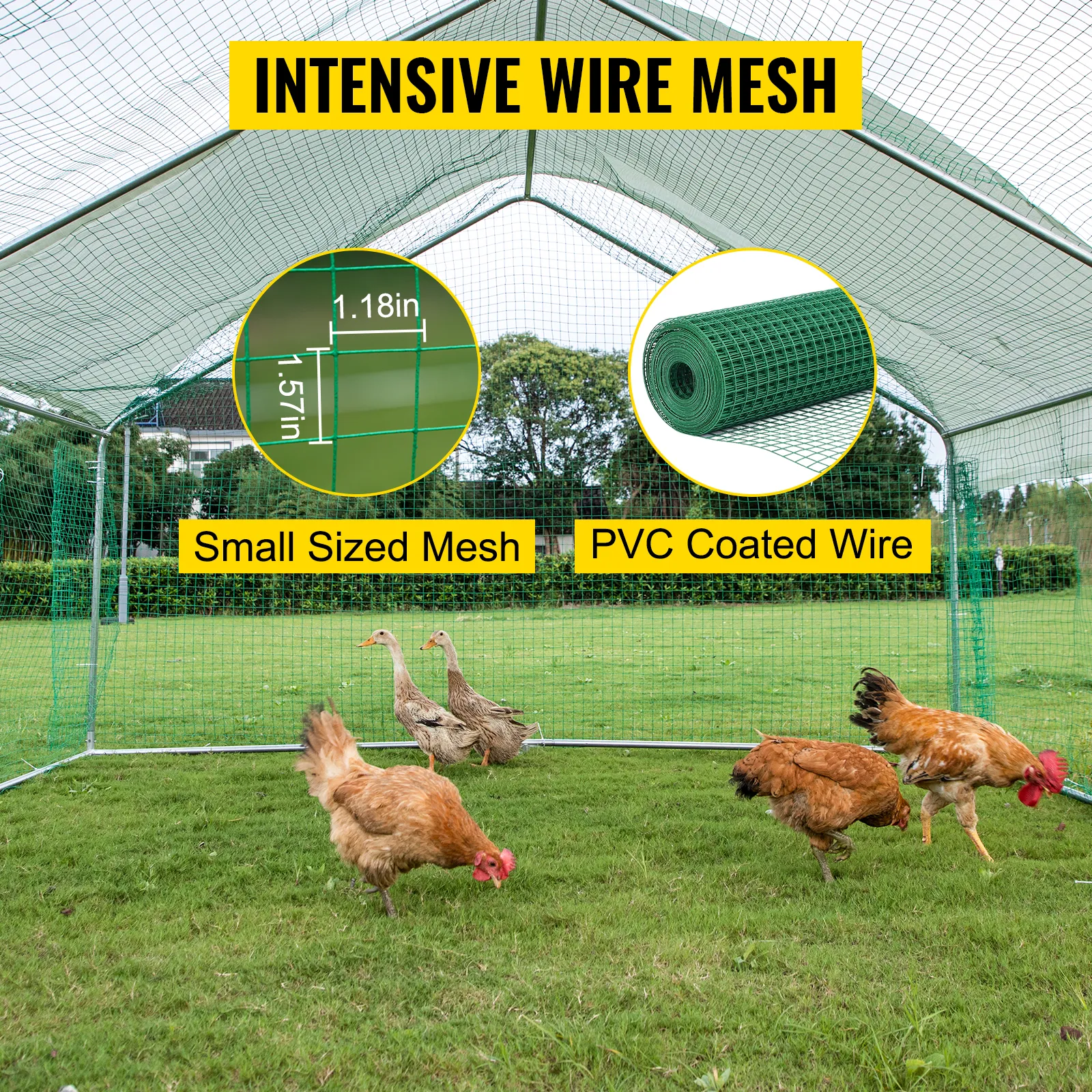 The quadrangle wire mesh can keep the poultry inside the cage and avoid them coming out to mess with your backyard or farm. It is coated with PVC on the outside, secure for the chickens' touch and grip.