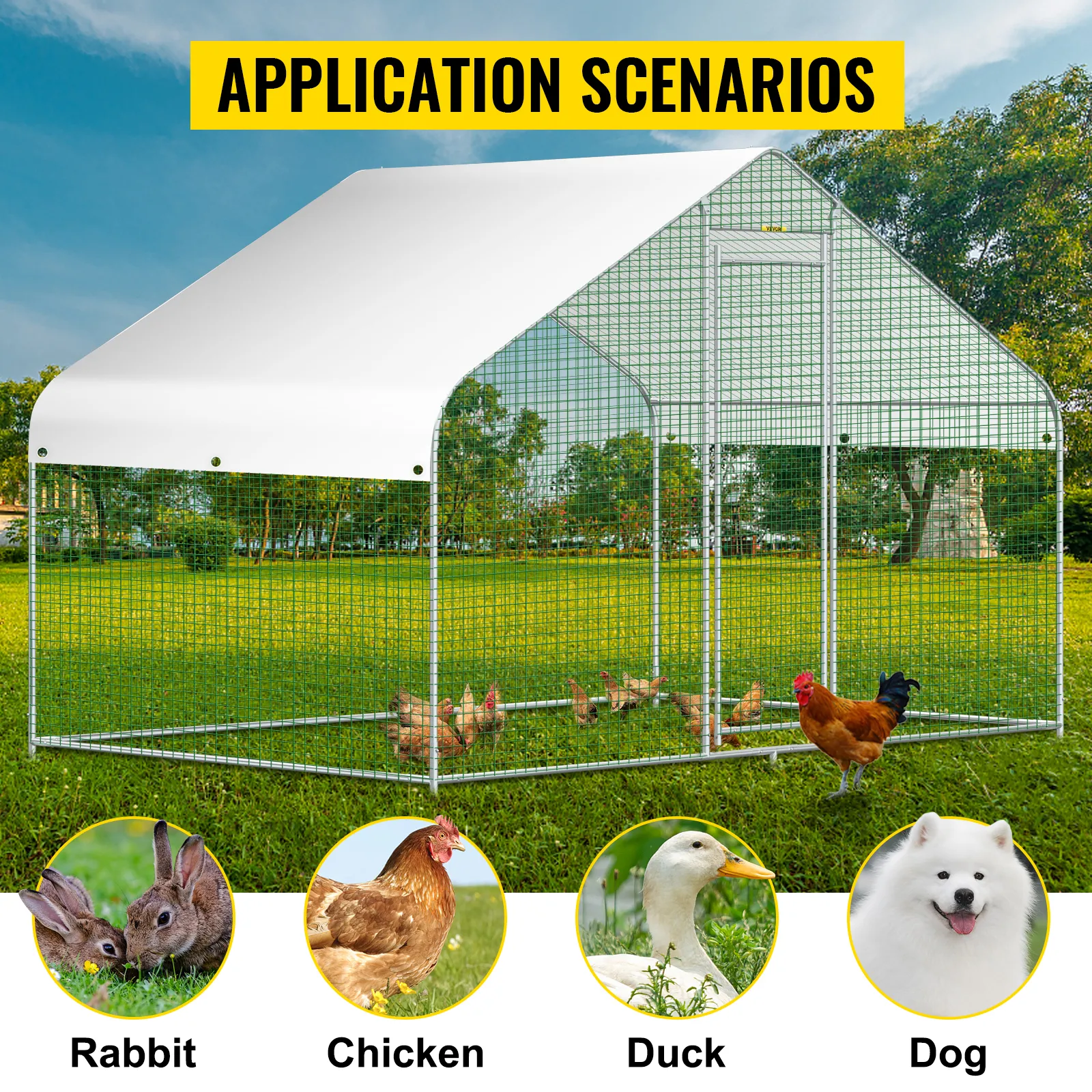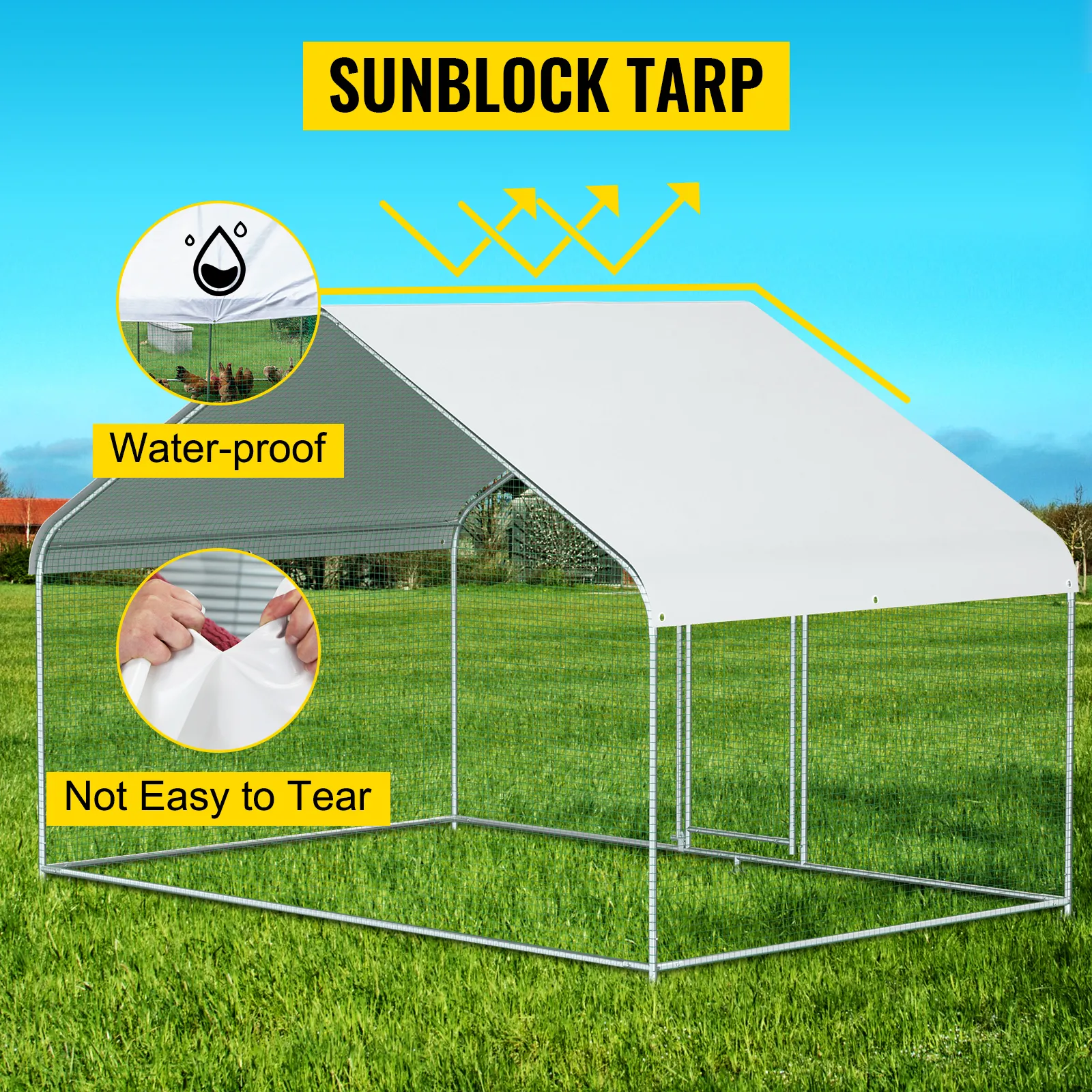 Featuring a durable sun and rain-proof tarp on the top, it is protective for the steel frame, wire mesh and animals under its cover. And the tarp is sturdy enough to avoid tear up or fade over time.