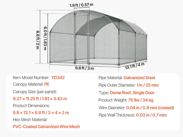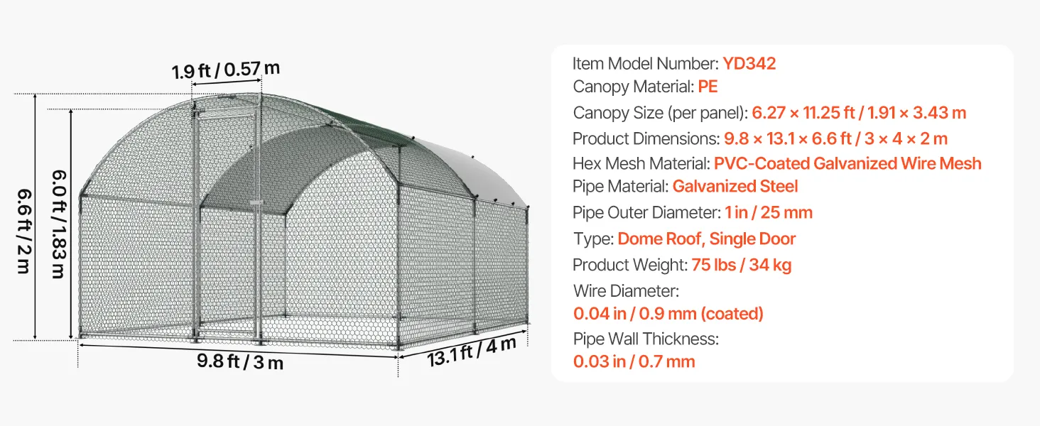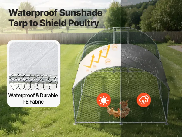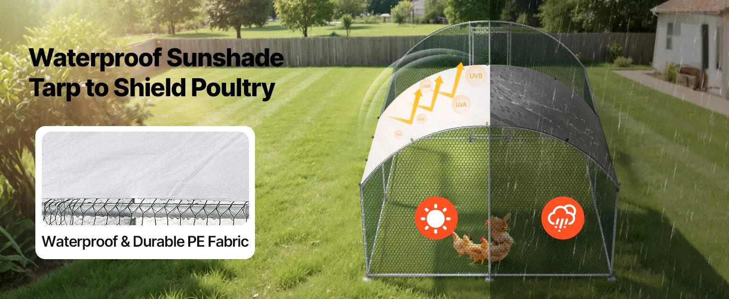 Spacious Living Area: This chicken coop run with a generous 9.8x13.1x6.5 ft of space, features four-sided ventilation, creating a healthy and comfortable environment. The PE-coated canopy provides sun protection, waterproofing, and tear resistance, shielding your poultry from external elements.