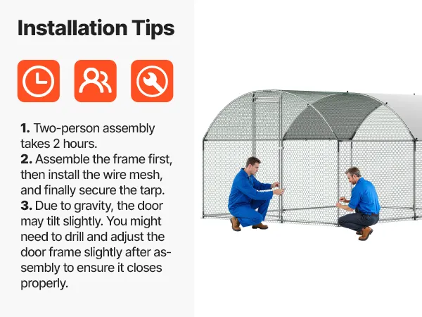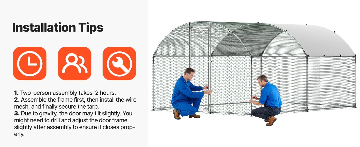 Easy Installation: With easy-to-use accessories, installation is a breeze. You can reinforce the chicken runs for yard with cover by adding wood or stones to the bottom. For added protection against wildlife like raccoons, we recommend adding a galvanized wire fence.