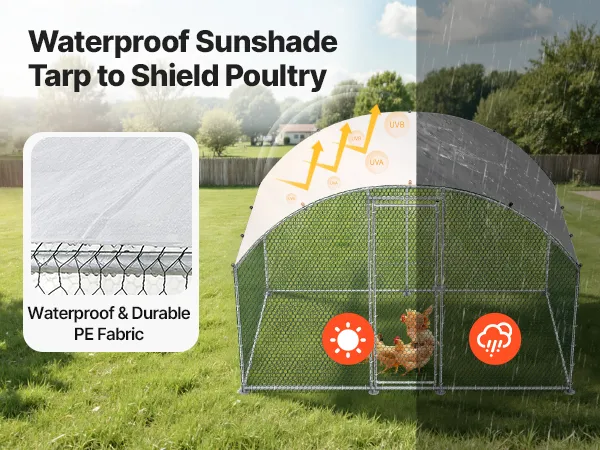 Spacious Living Area: This chicken coop with run with a generous 9.8x6.5x6.5ft space, features four-sided ventilation, creating a healthy and comfortable environment. The PE-coated canopy provides sun protection, waterproofing, and tear resistance, shielding your poultry from external elements.