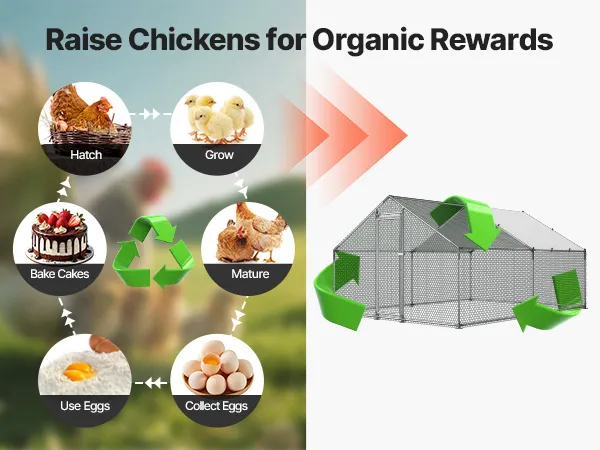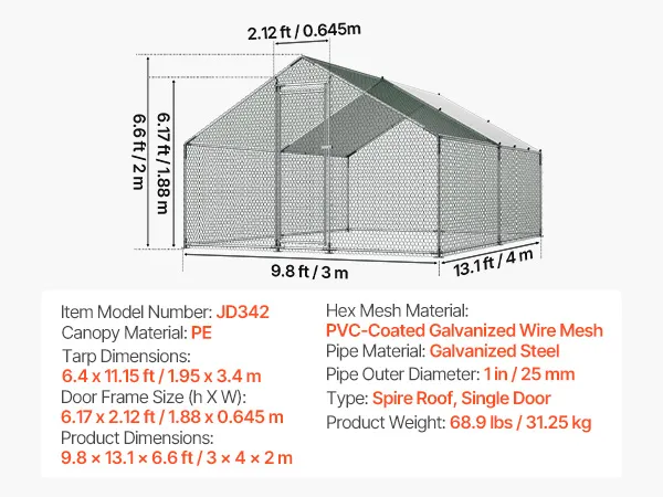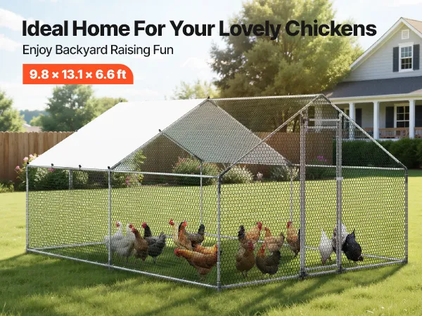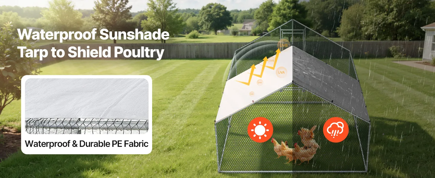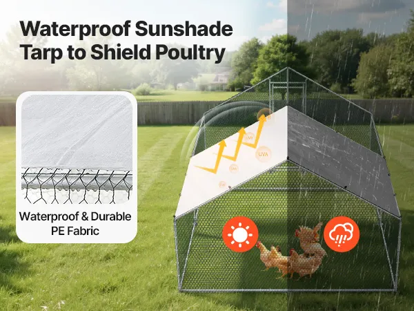 Spacious Living Area: With 9.8x13.1x6.6 ft of space, the metal chicken coop features four-sided ventilation for a comfortable environment. The PE-coated canopy provides sun protection, waterproofing, and tear resistance to shield poultry from the elements