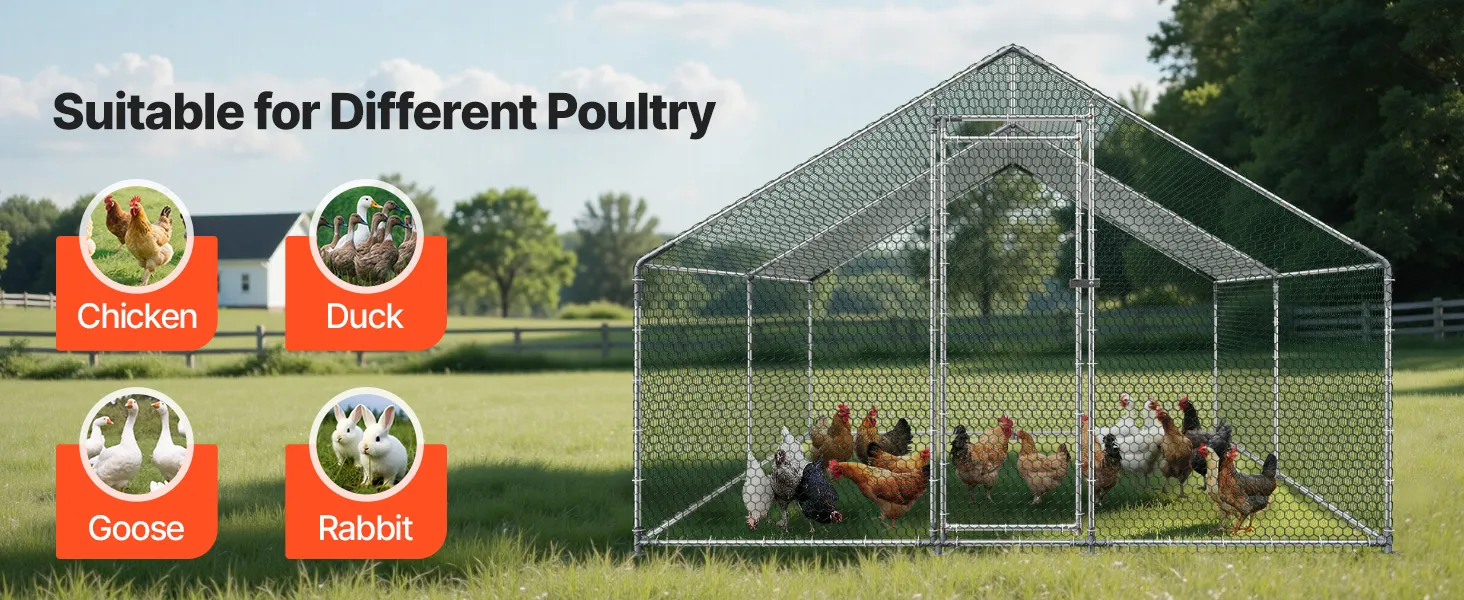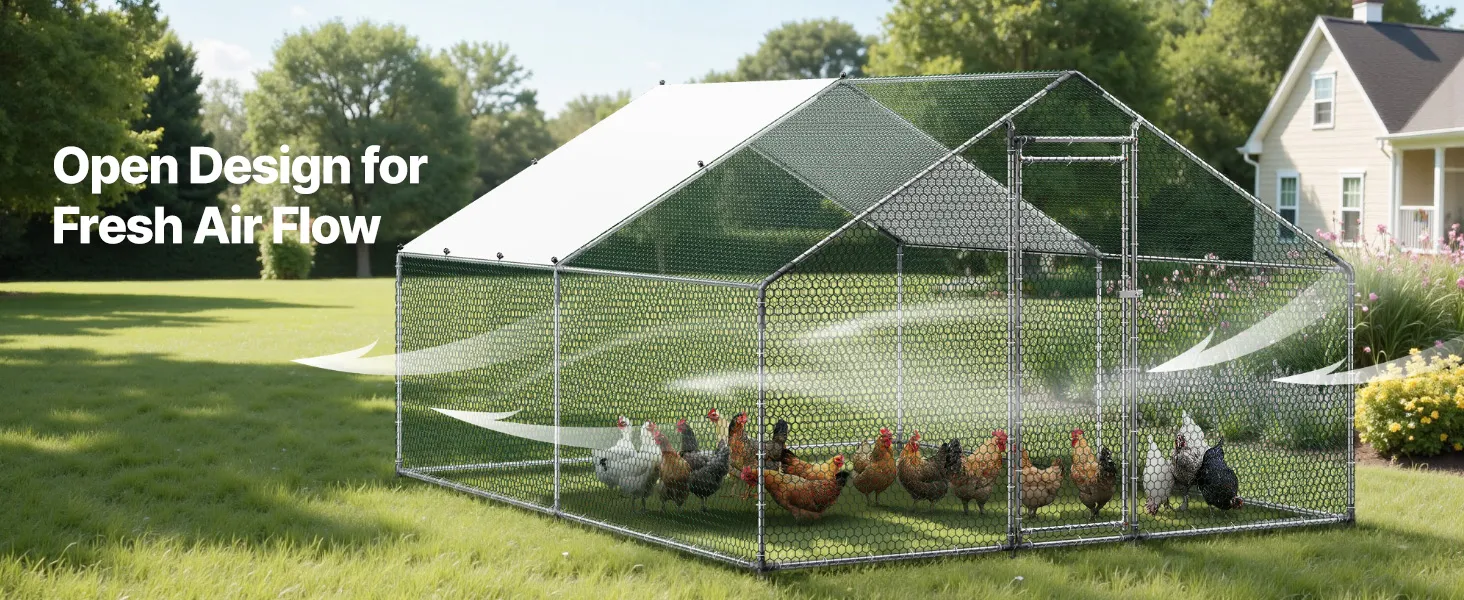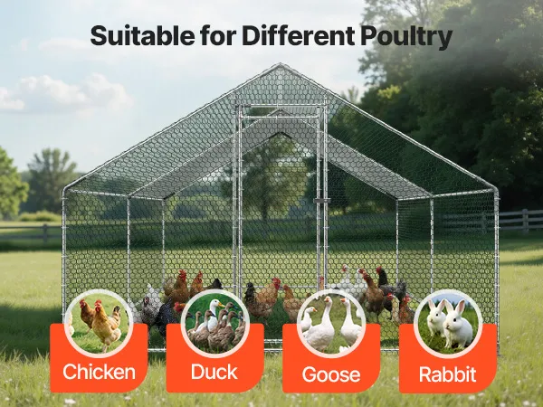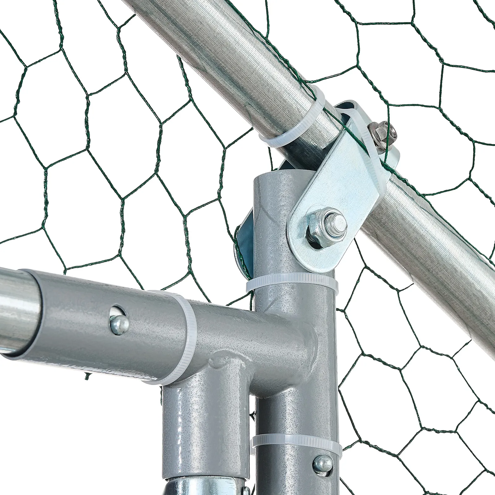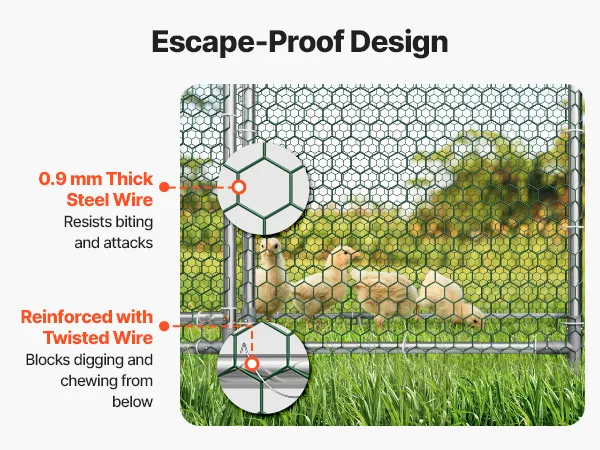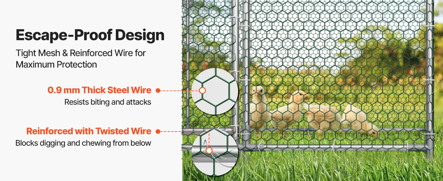 Sturdy Structure: With 1" thick galvanized steel pipes and precise welding, this walk in chicken run boasts stability and wind resistance. The top cover promotes drainage to avoid water buildup. Reinforced hexagonal mesh keeps poultry securely contained