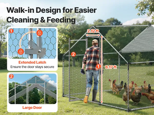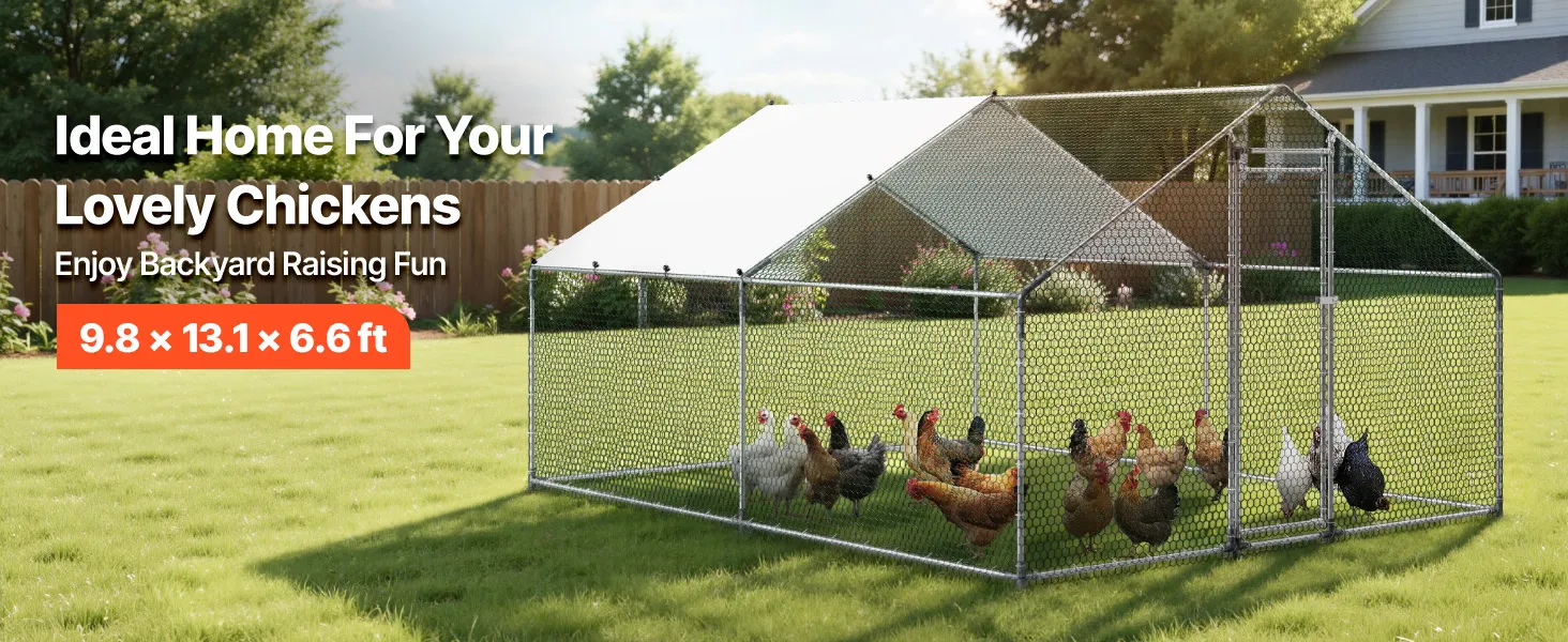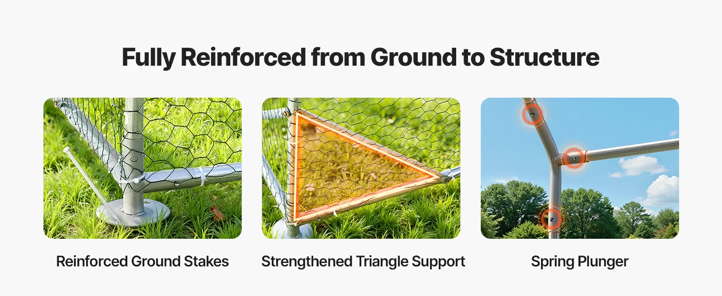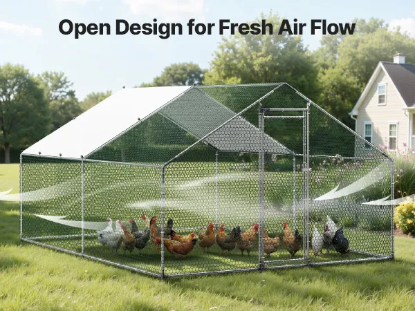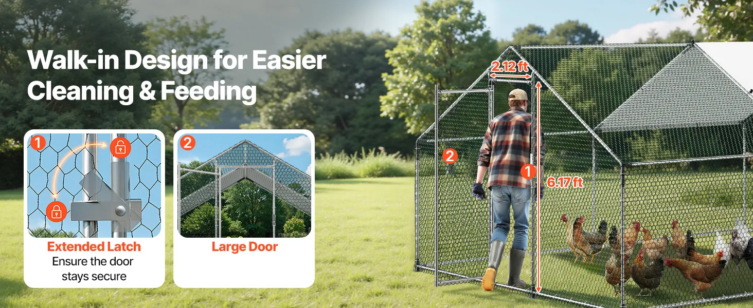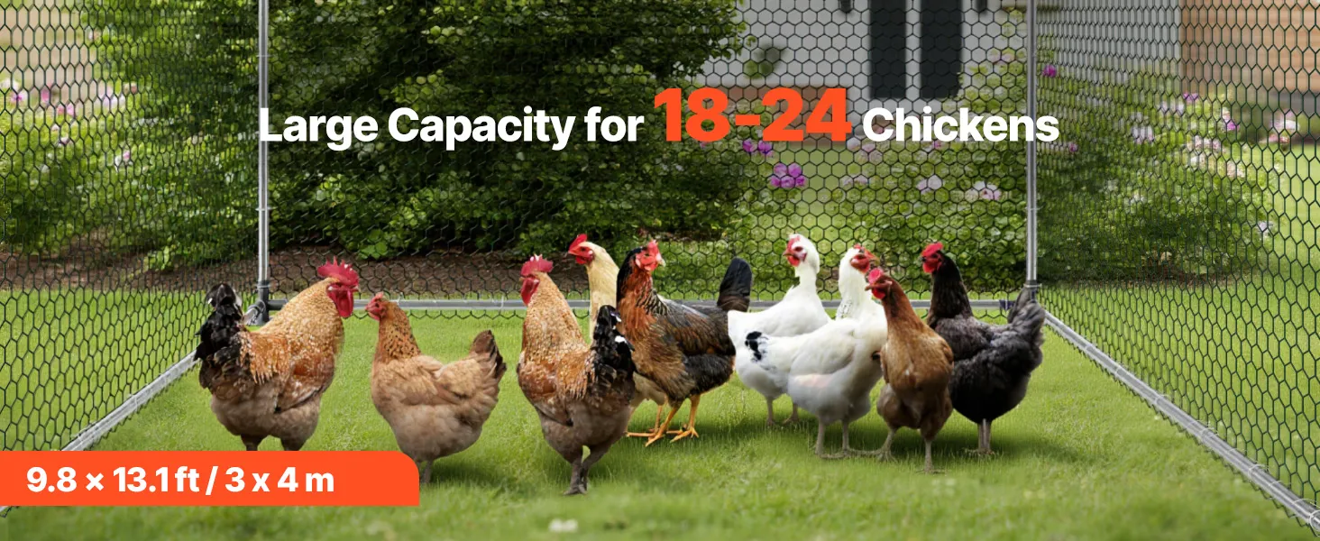 Sturdy Structure: With 1" thick galvanized steel pipes and precise welding, this walk in chicken run boasts stability and wind resistance. The top cover promotes drainage to avoid water buildup. Reinforced hexagonal mesh keeps poultry securely contained