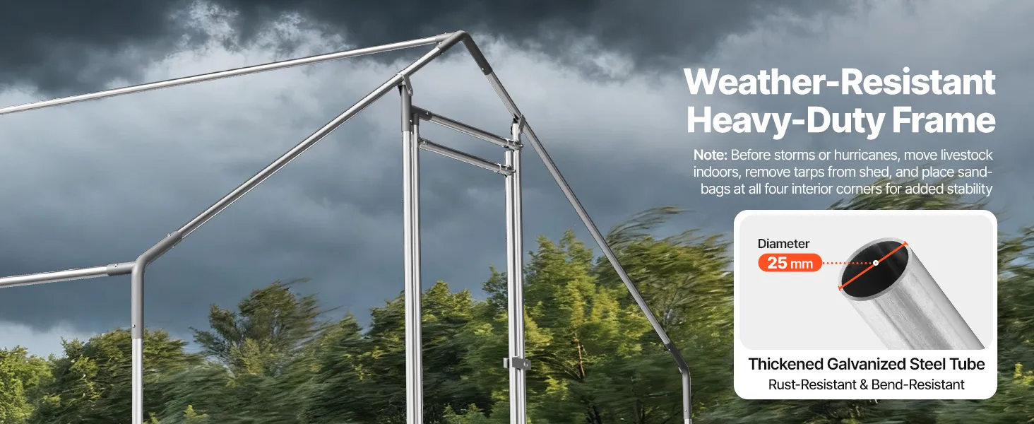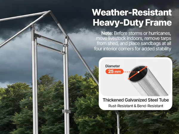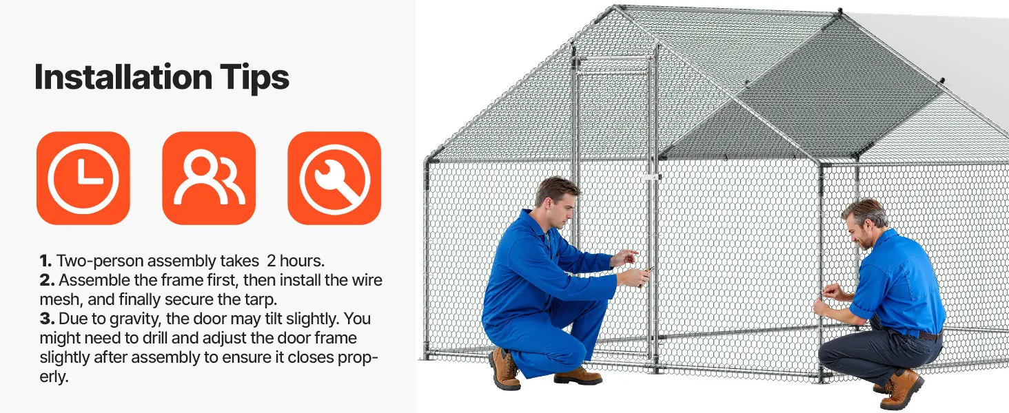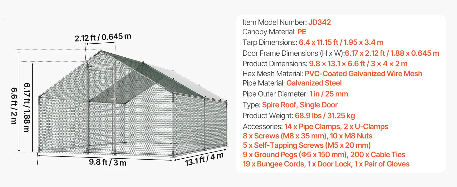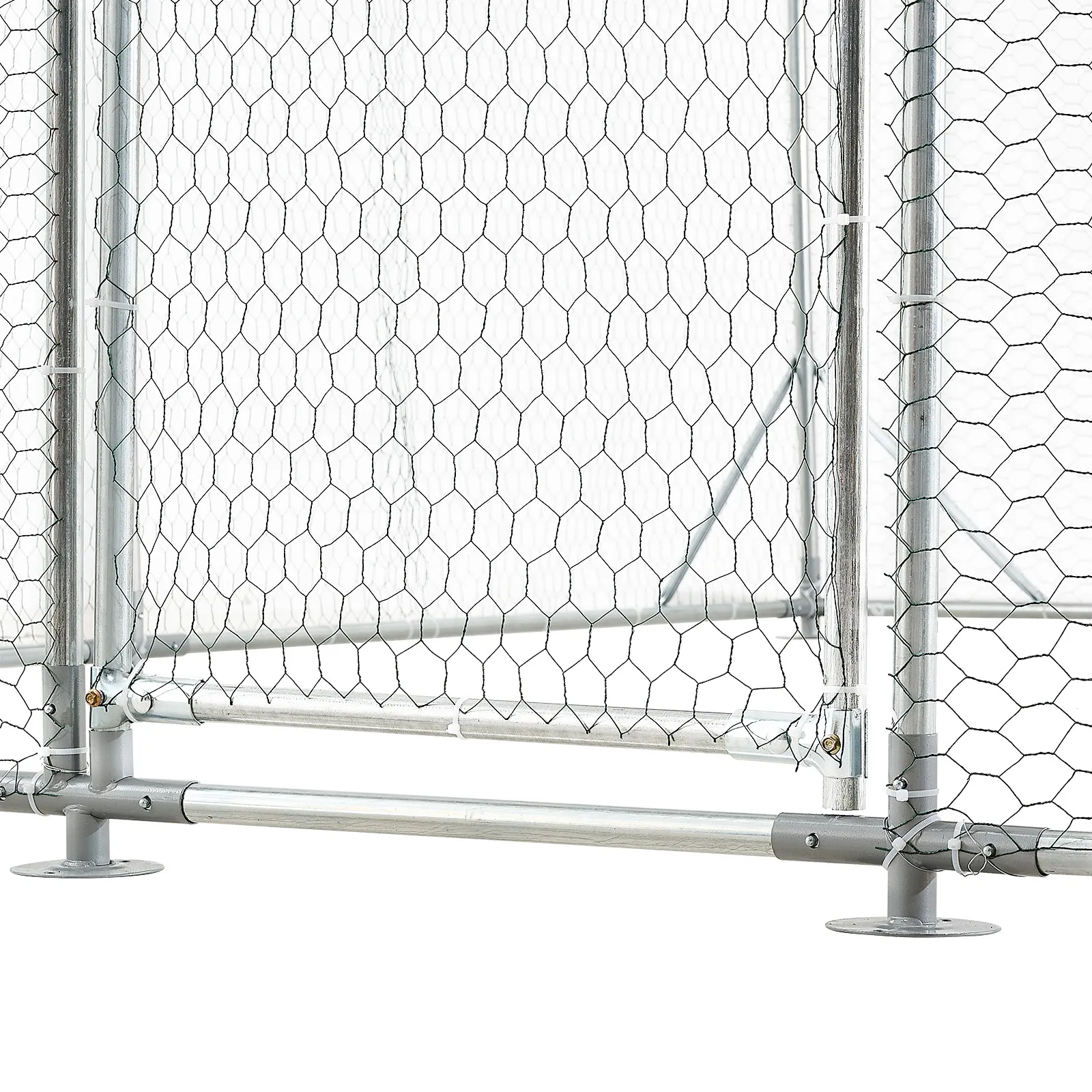 Sturdy Structure: With 1" thick galvanized steel pipes and precise welding, this walk in chicken run boasts stability and wind resistance. The top cover promotes drainage to avoid water buildup. Reinforced hexagonal mesh keeps poultry securely contained