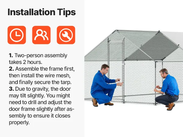 Easy Installation: With easy-to-use accessories, installation is a breeze. You can reinforce the metal chicken run by adding wood or stones to the bottom. For added protection against wildlife like raccoons, we recommend adding a galvanized wire fence