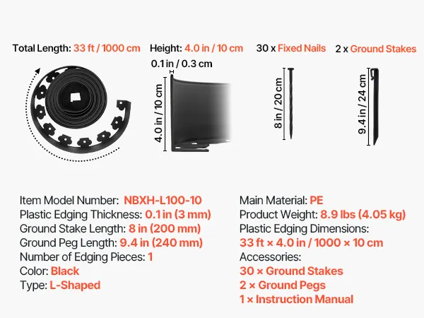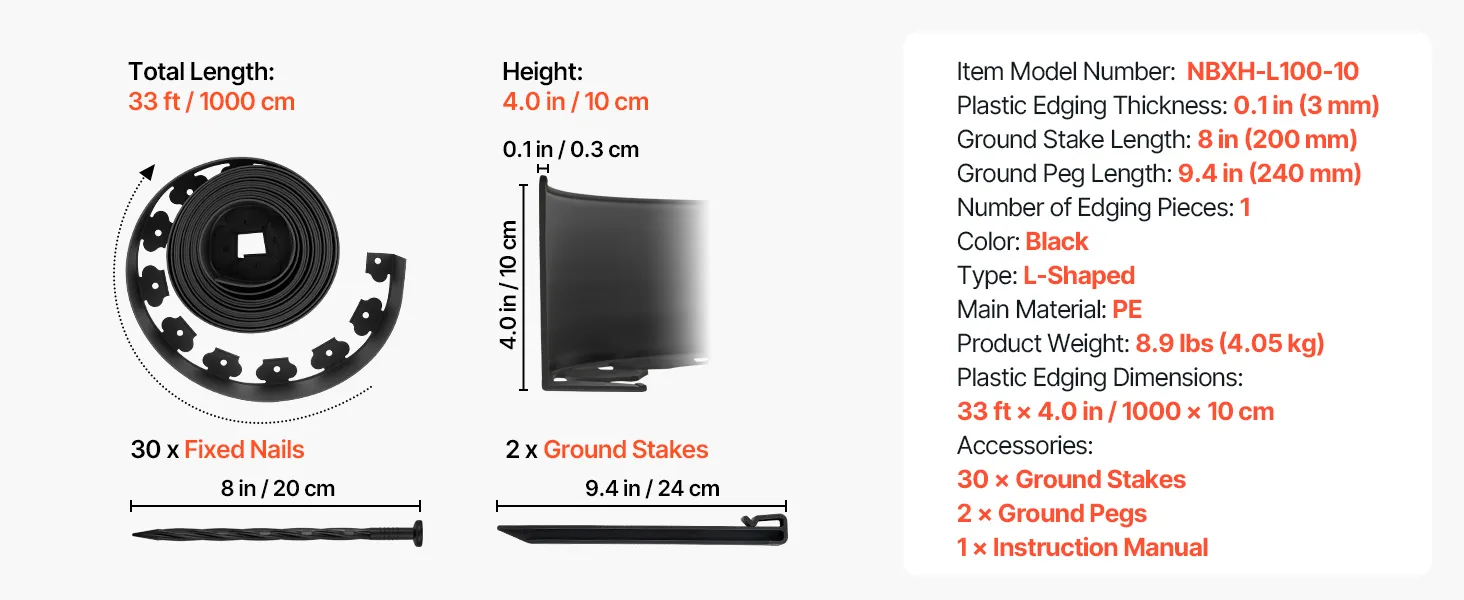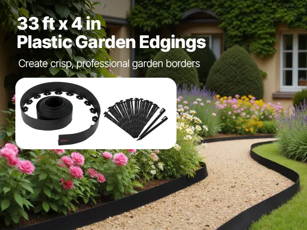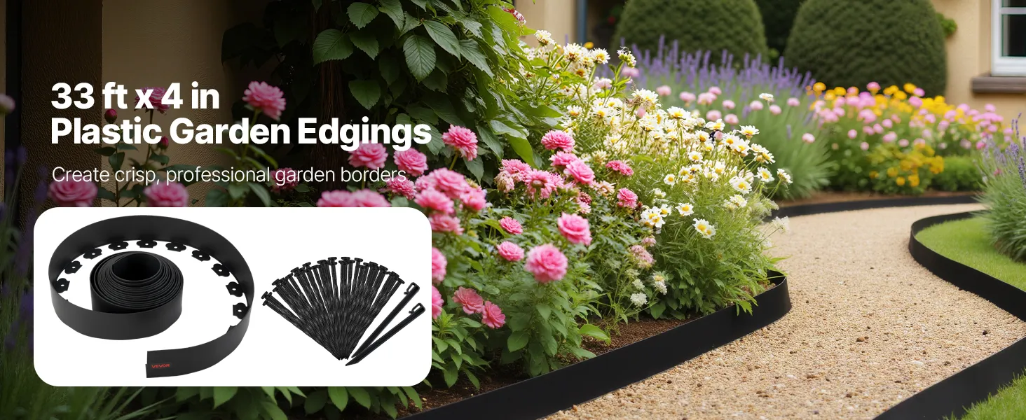 33 ft x 4 in Garden Edging: This 33 ft flexible landscape edging strip is ideal for medium-sized yards, lawns, and tree ring borders. The 4 in raised height effectively blocks grass root spread and keeps garden boundaries neat.