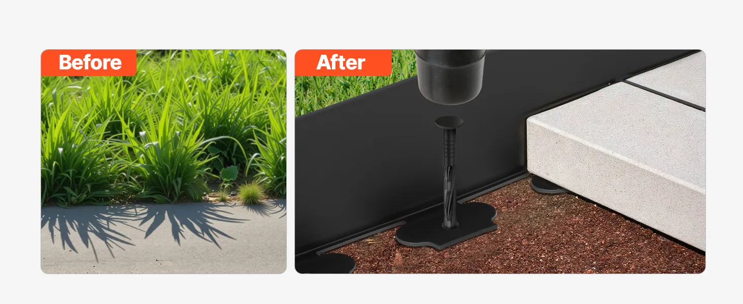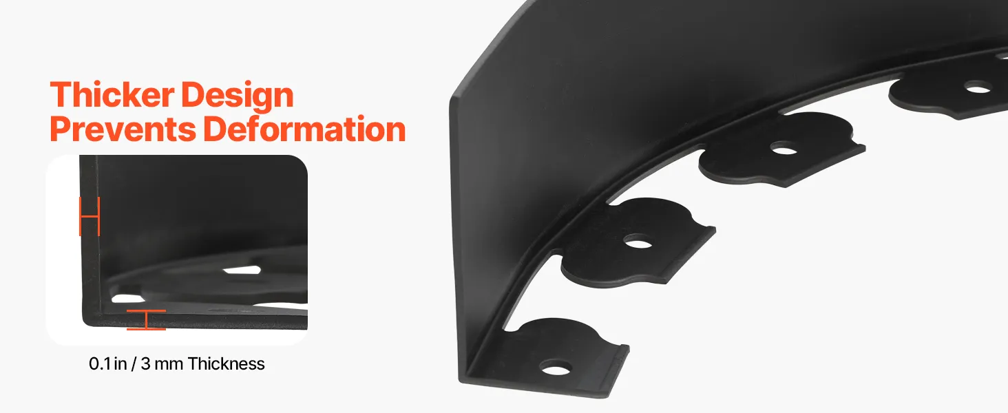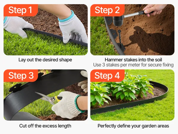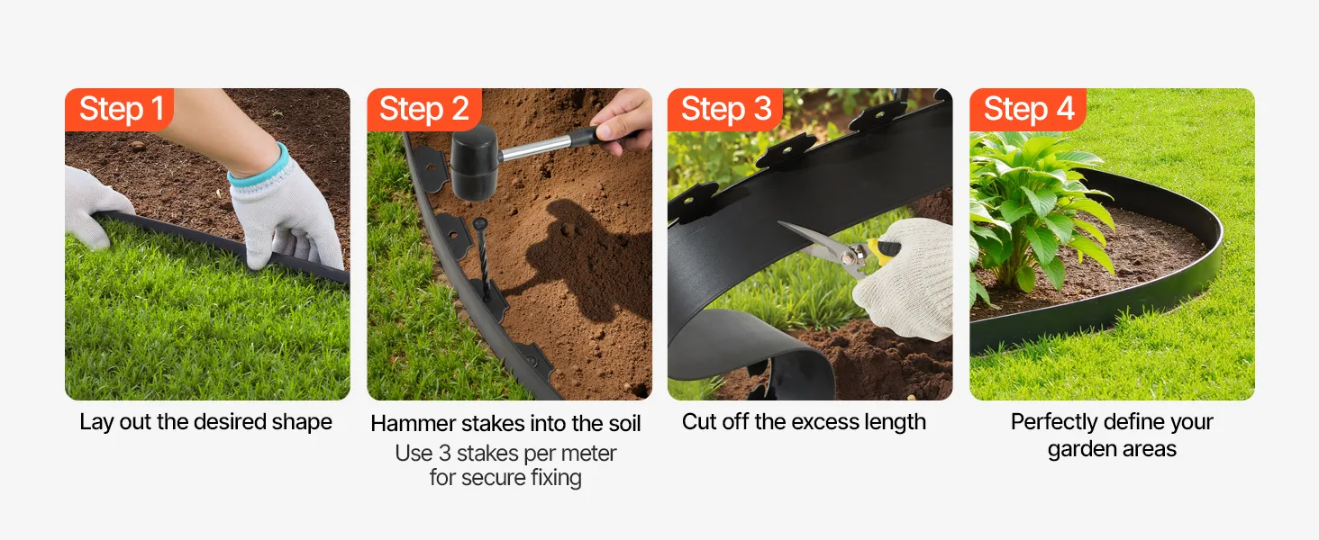 Easy to Set up: Lay the plastic garden edging along the edge and secure using a hammer and the included spikes. Use ground stakes to reinforce joints. No digging or concrete required.