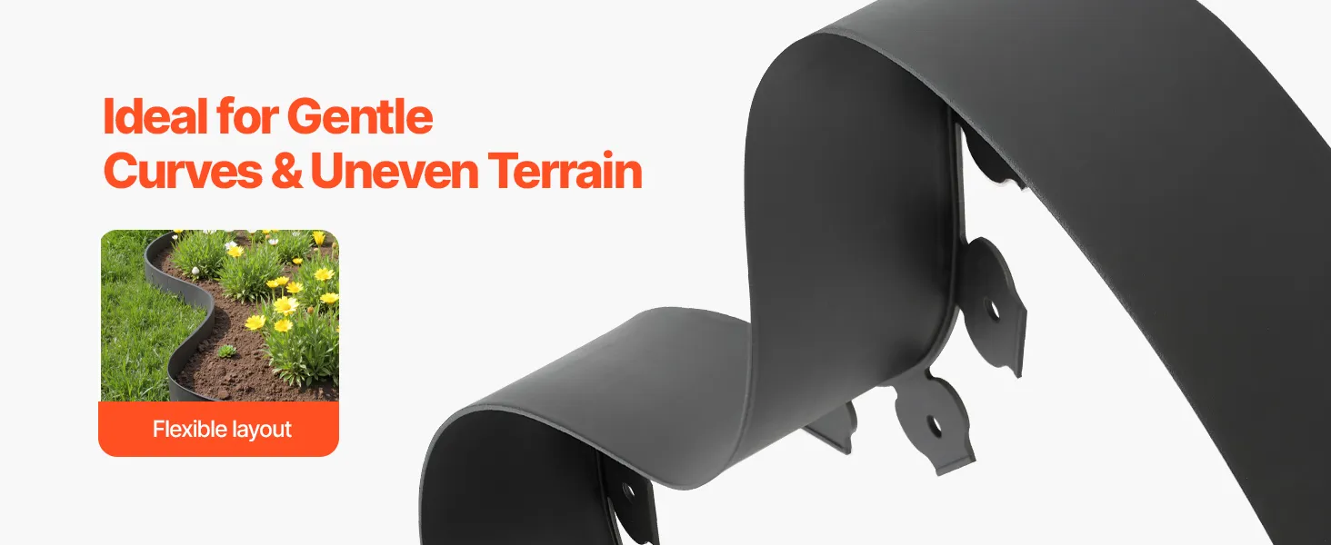 Flexible for Curves & Contours: The plastic lawn edging can be straighten or bend to follow flower bed edges, tree rings, or uneven terrain. Cut to desired length as needed.
