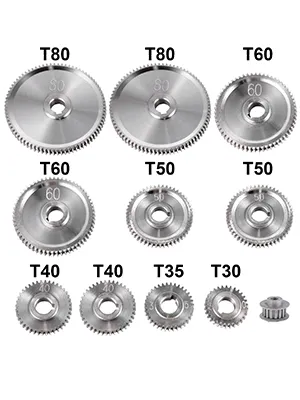 The lathe gear is composed of 2 x 80T gears, 2 x 60T gears, 2 x 50T gears, 2 x 40T gears, 1 x 35T gear, 1 x 30T gear, 1 x 17 T gear and 2 extra belts.