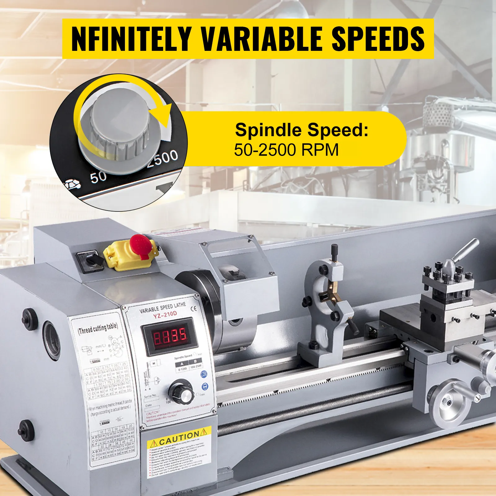 Infinitely Variable Speeds: Revolving Speed Range: 50-2500 RPM. The mini lathe machine comes with variable speeds that give you the convenience to achieve the best work. This lathe allows you to work on both forward or reverse of any possible speed. The feeding rate can be adjusted manually or automatically. And an emergency button is accessible just in case.