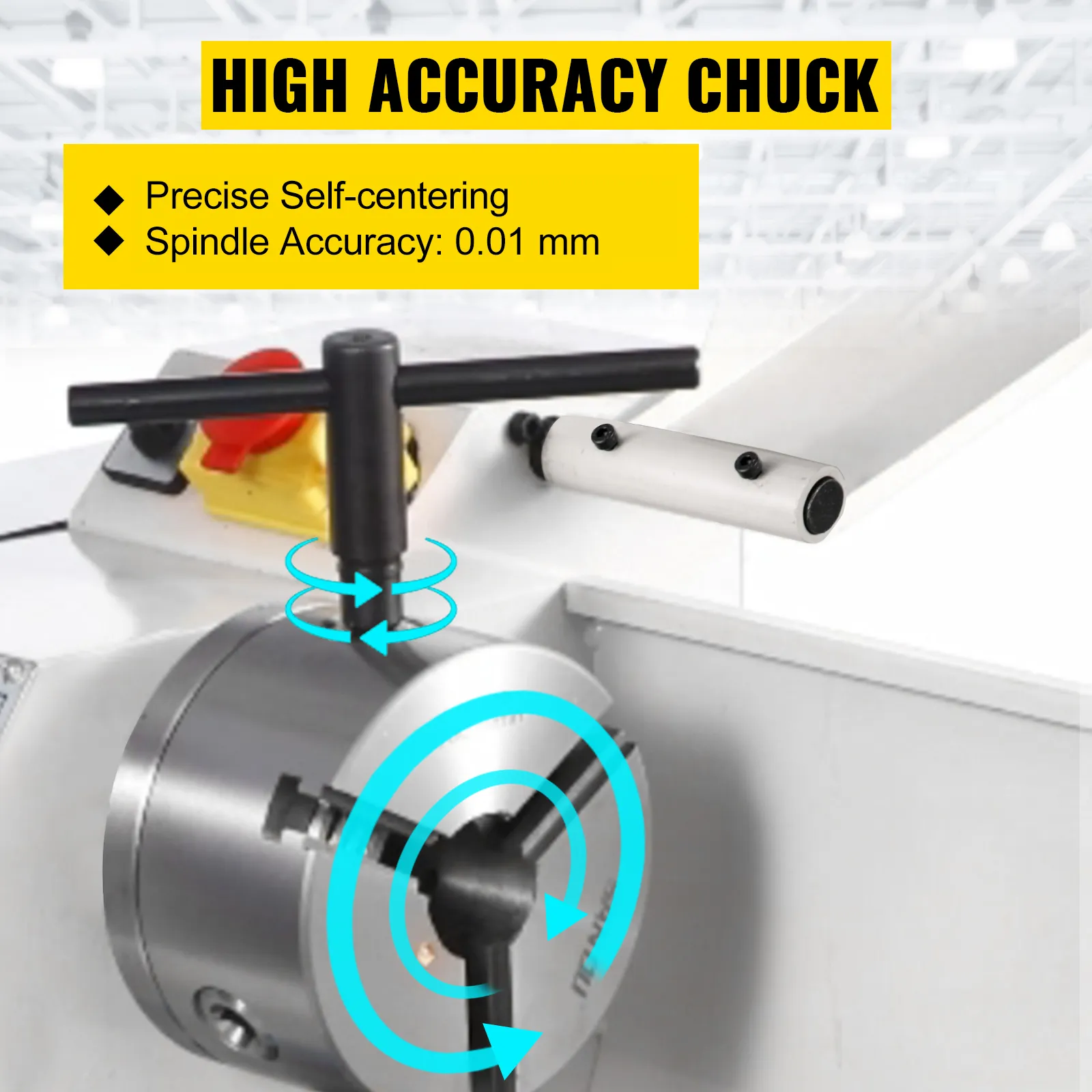 Works with Precision: Spindle Bore: 1.5" / 38 mm. The metal working lathe is preinstalled with a 3-jaw chuck, 4.9" / 125 mm in diameter, that can clamp raw materials tight, and a back splash guard that prevents metal filings.