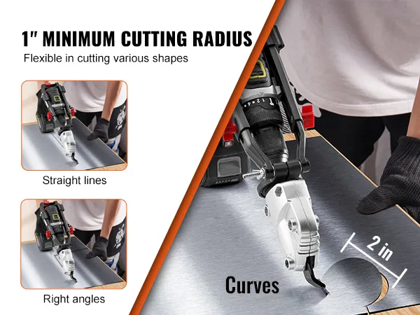 Flexible Operation: With a 360-degree rotating head, the metal shears drill attachment can be adjusted to the desired position, providing comfortable cutting from any angle or direction. It is ideal for cutting straight lines, large curves, circles, and irregular shapes.
