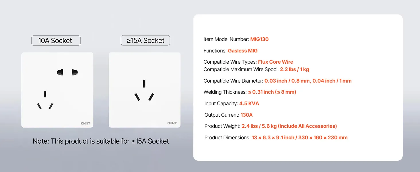 Wire Compatibility: This mig welding machine is compatible with flux core wire, supporting a maximum wire capacity of 2.2 lbs (1 kg). Suitable for 0.03" (0.8mm) & 0.04" (1.0mm) flux core wire. (NOTE: This product is suitable for ≥15A Socket)