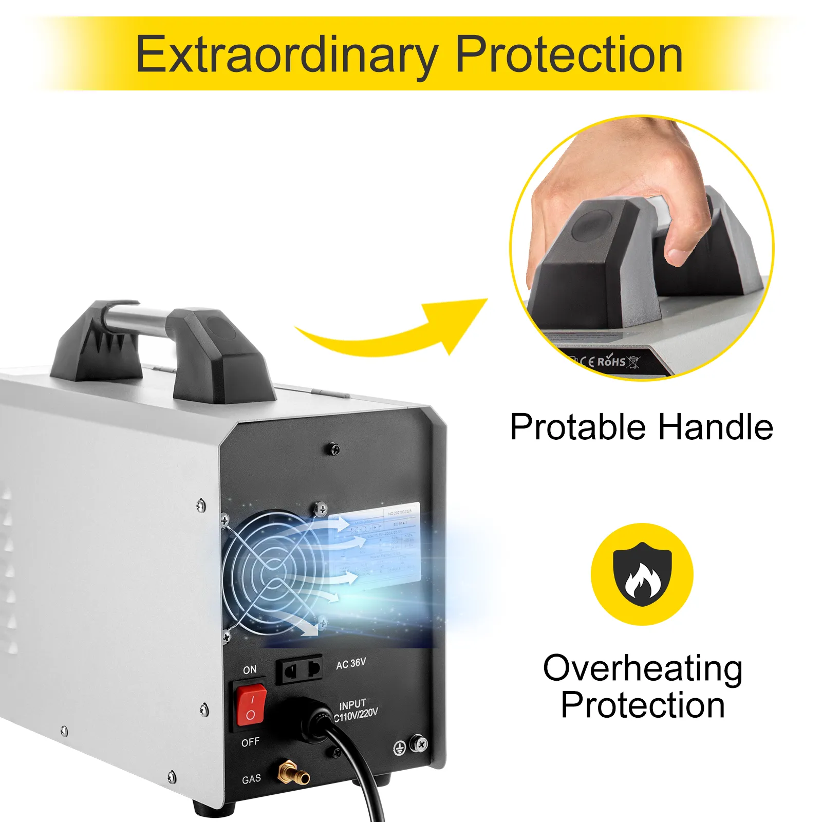 This welding machine has so big welding current when working that nature ventilation can not meet the cooling demand. At the same time, the inner fan enables the device to work steadily by its effective cooling.