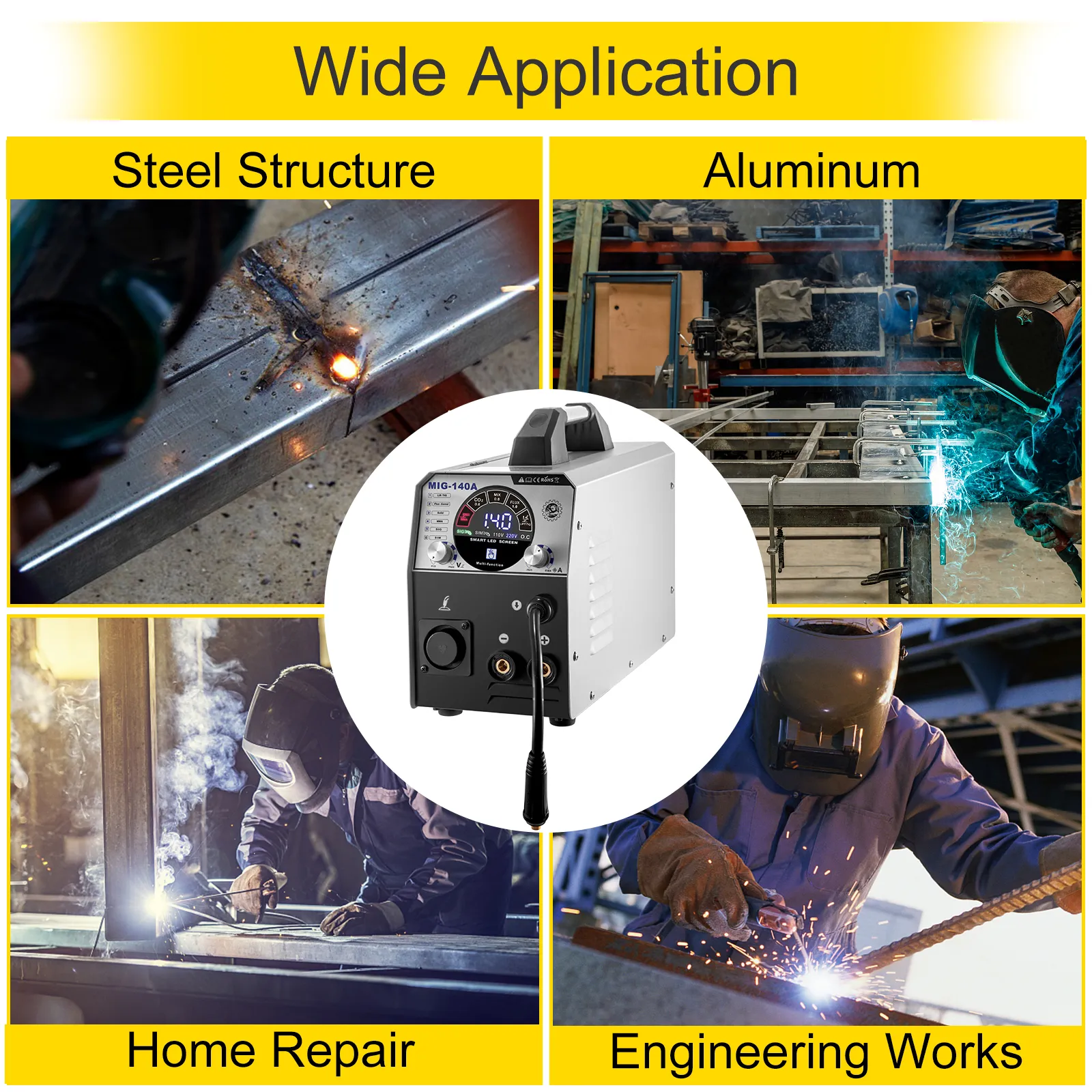 The MIG welder broadens its application horizon, such as welding aluminum, stainless steel, carbon steel, and other metal material. Our welding machine is suitable for DIY lovers and professional welders when they come to maintenance, repair, and metal fabrication.