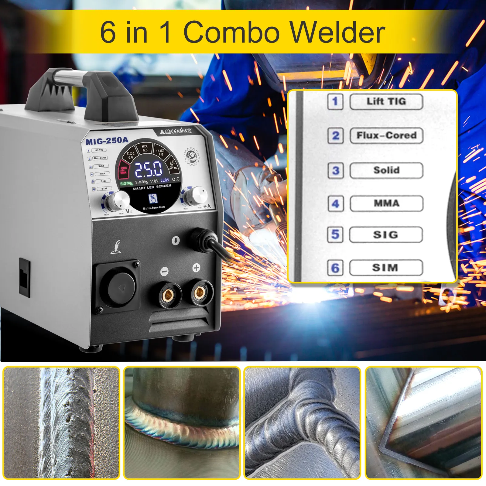 Multi-mode of LIFT TIG, FLUX-Cored, Solid, MMA, SIG, SIM makes it an excellent tool for DIY users, maintenance and repair, and metal fabrication, including aluminum, stainless steel, carbon steel, mild steel, other metal material.