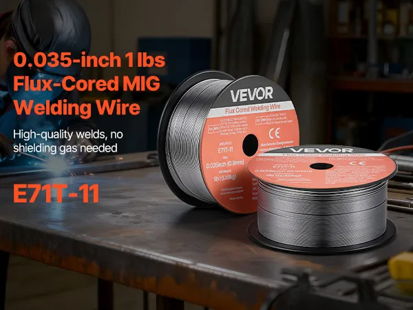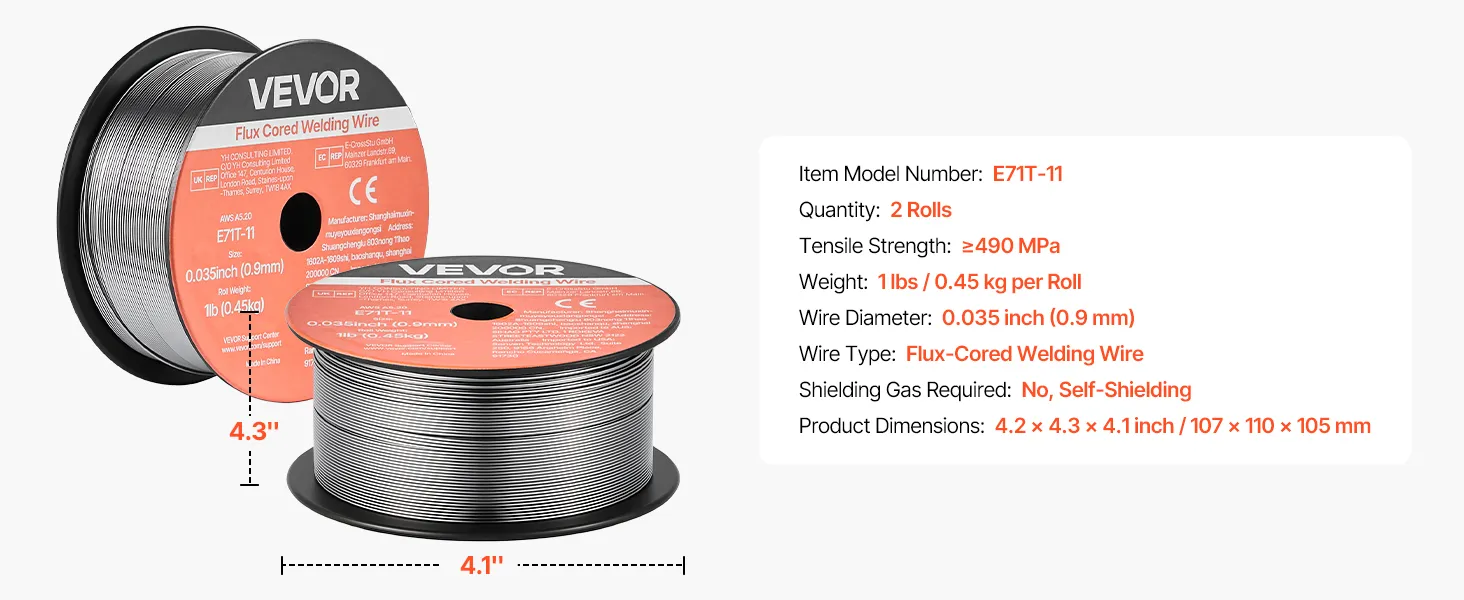 VEVOR 0.9mm 0.45kg E71T-11 flux core welding wire delivers strong, consistent welds with smooth wire feeding and low spatter. Supports all-position gasless welding, multi-pass welding and high tensile strength for reliable performance in automotive, machinery, and DIY welding projects.