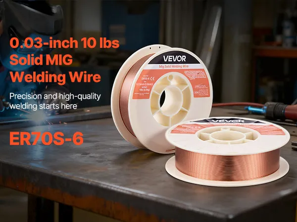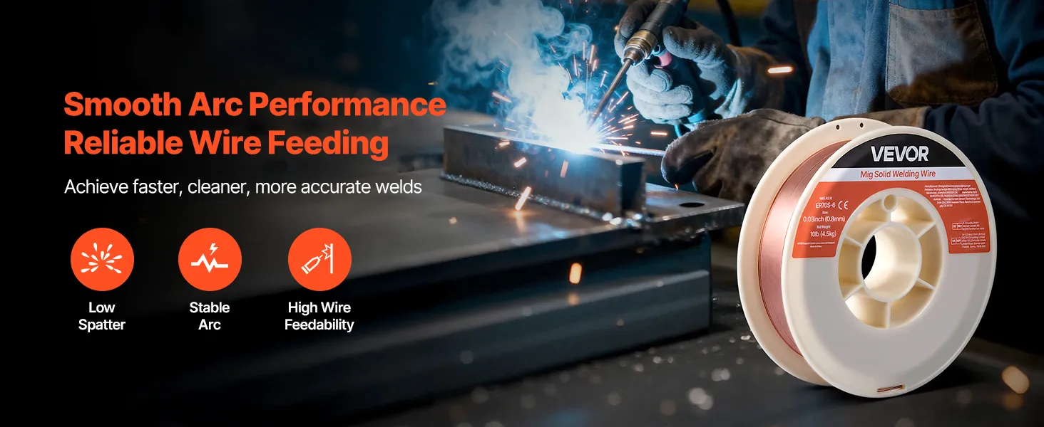 VEVOR 0.8mm 4.5kg ER70S-6 solid MIG welding wire delivers strong, consistent welds with smooth wire feeding, low spatter, and stable arc action. Supports all-position welding and high tensile strength for reliable performance in automotive, machinery, and DIY welding projects.