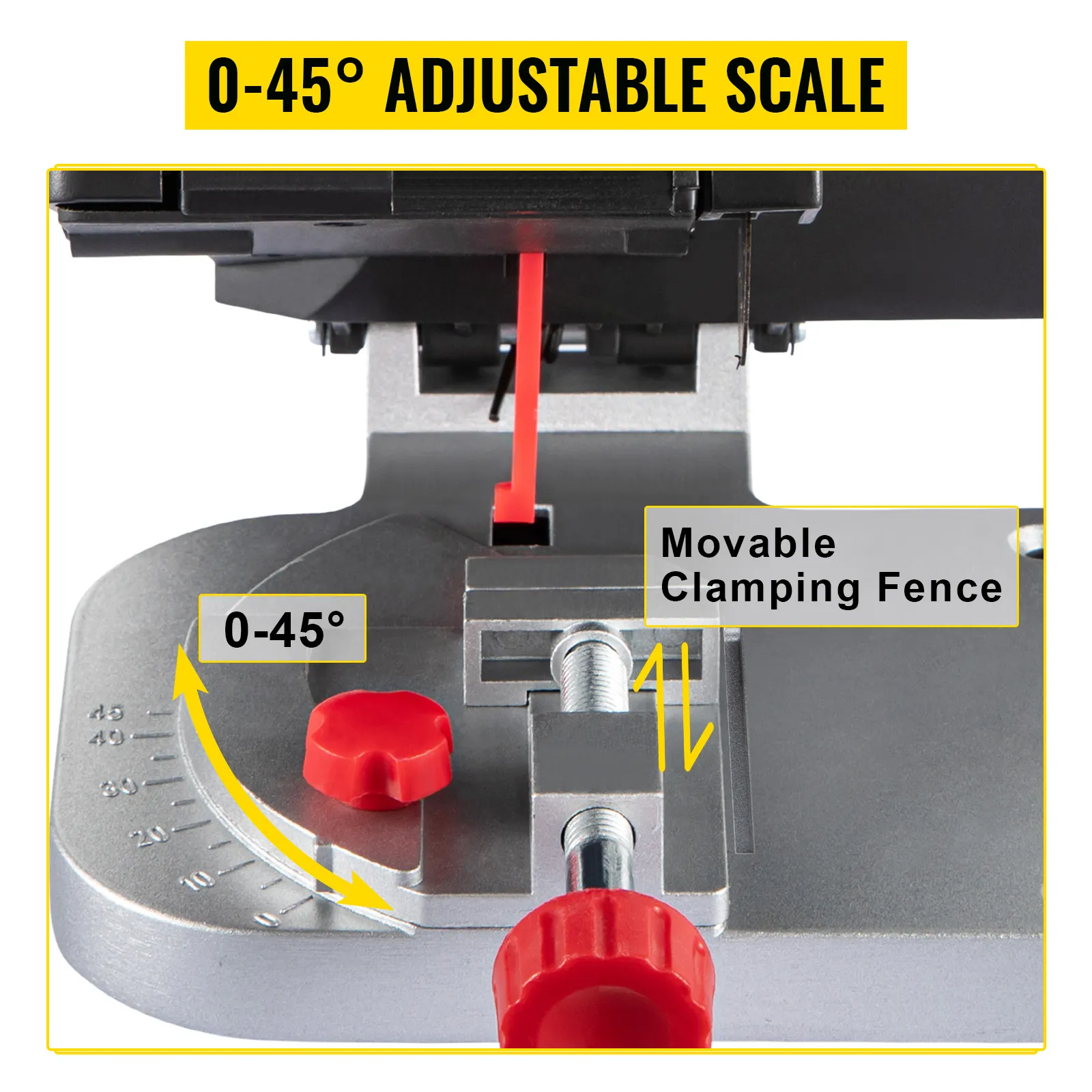 The angle gauge of the mini miter saw allows 0° to 45° cutting. The movable clamping fence can be pushed for tight clamping and width adjustment.