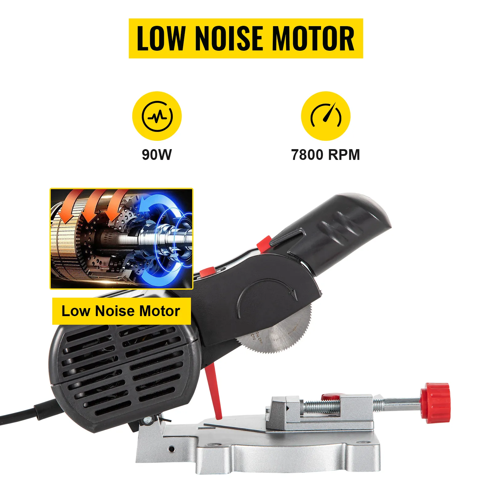 Don't be fooled by the 90W low-noise motor. Our mini miter cut-off chop saw can generate a 7800 RPM rotation speed, making it effortless to cut through a variety of materials in a really short time.