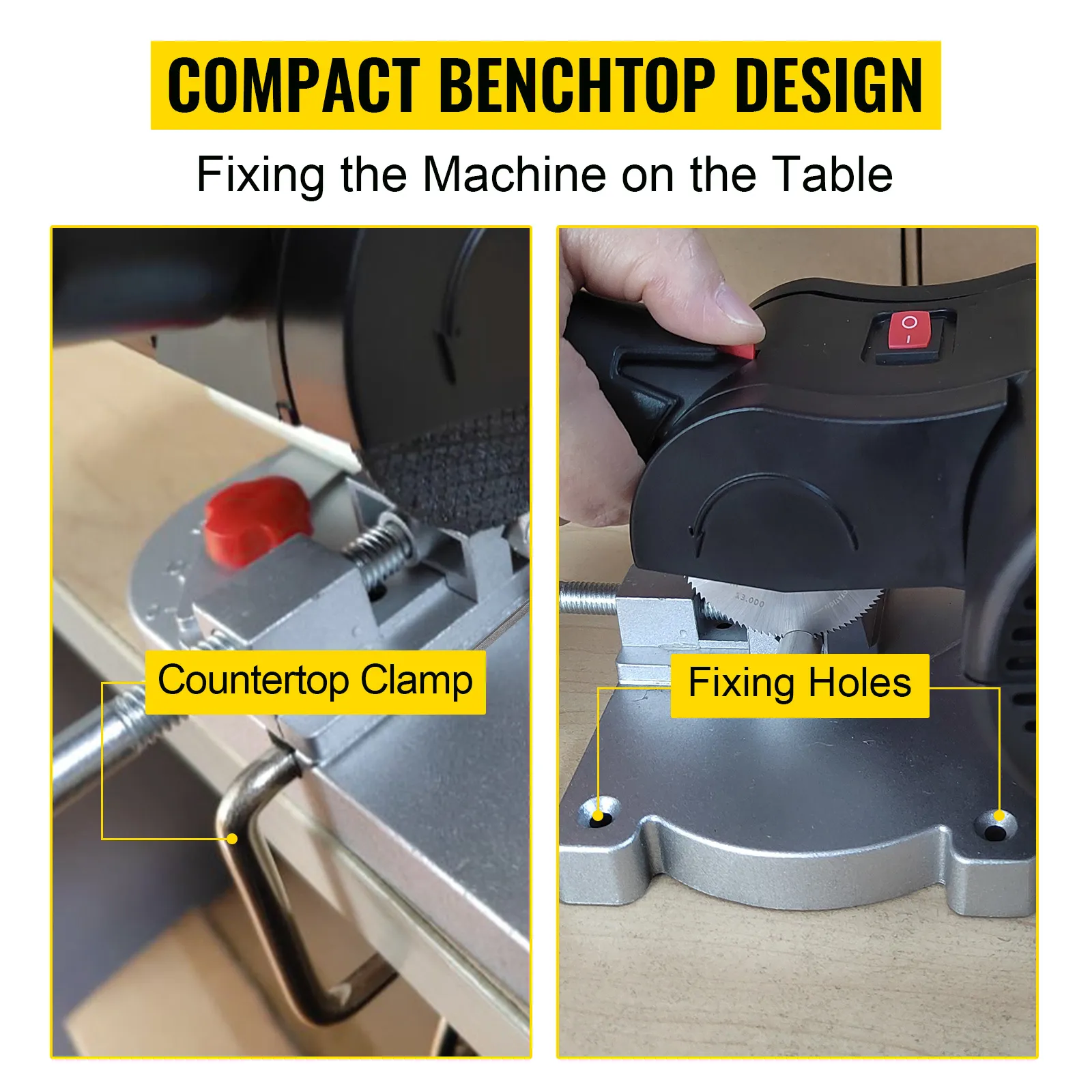 The base clamping jig can be fixed to the benchtop cut-off miter saw and placed on the desktop firmly. Furthermore, the machine is equipped with many holes, which you can fasten with screws for fixing.