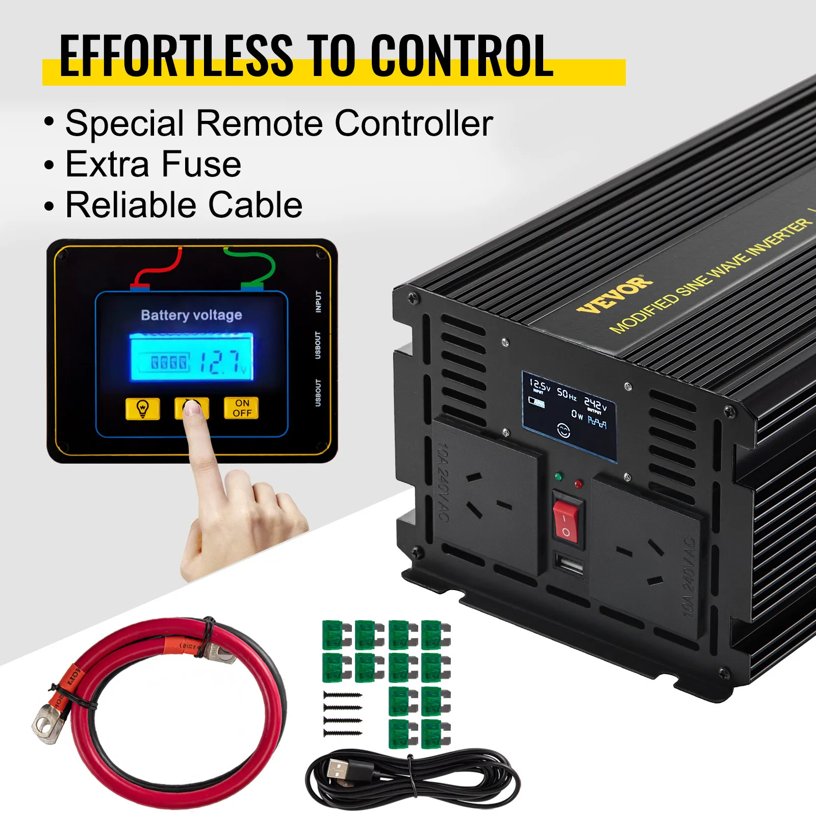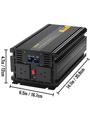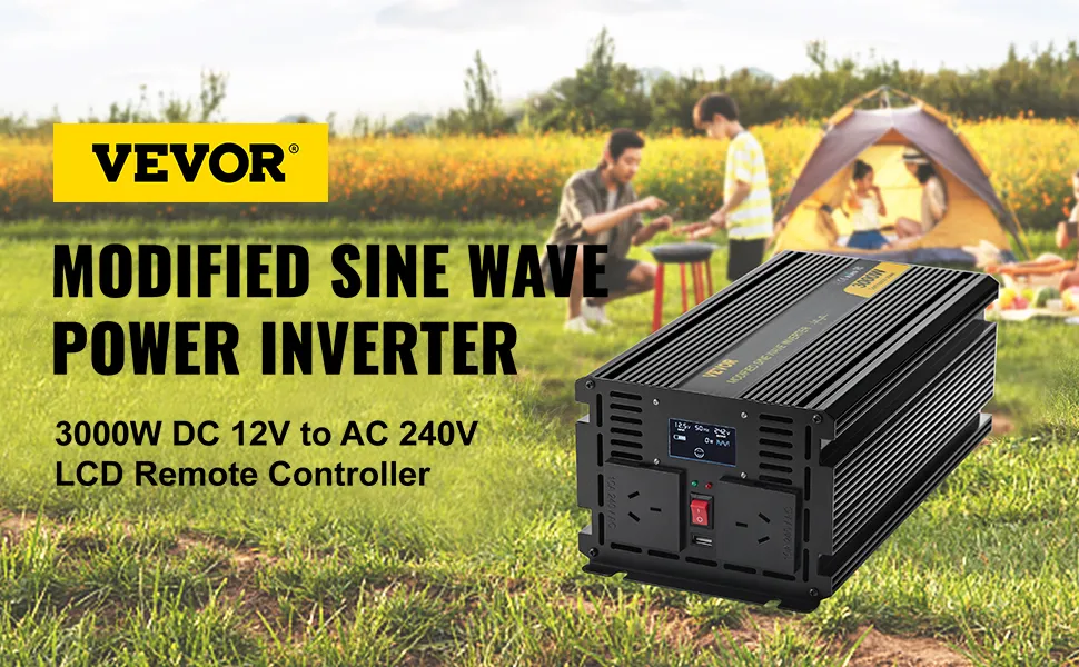 This modified sine wave inverter features an aluminum alloy shell, LCD screen, LED indicator, intelligent cooling fan, multiple protection measures, and LCD remote controller. Our power inverter transforms DC power into AC power, widely used for Emergency, Camping, Car, Home, RV, Solar. In addition, it is suitable for powering larger devices such as home appliances, power tools, like a blender, refrigerator, etc.