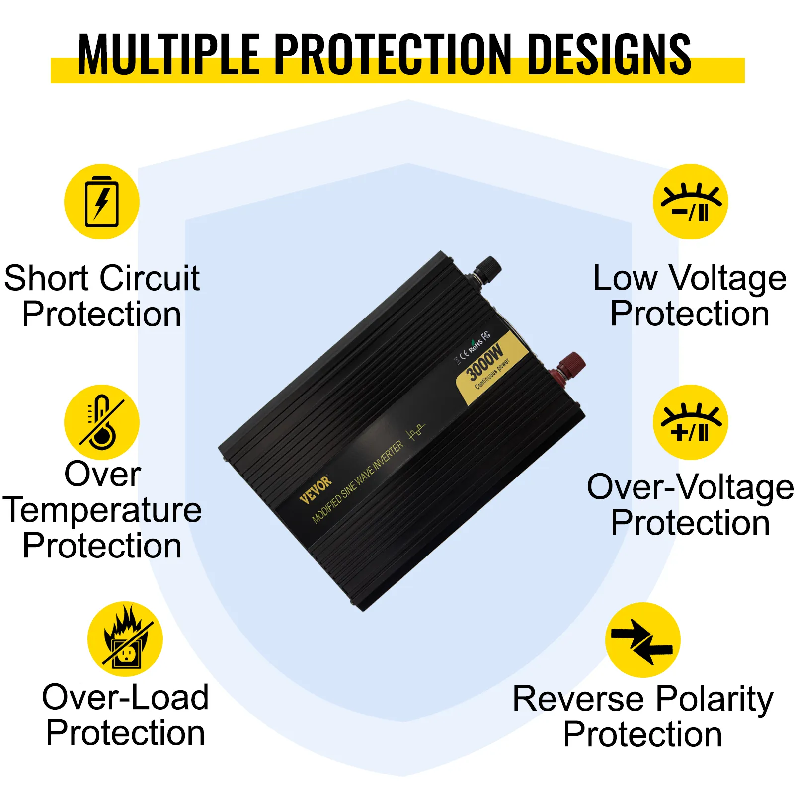 There are six main protection measures for an inverter: short circuit protection, over-temperature protection, over-load protection, low voltage protection, over-voltage protection, reverse polarity protection.
