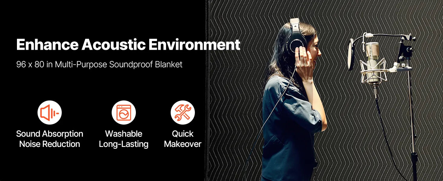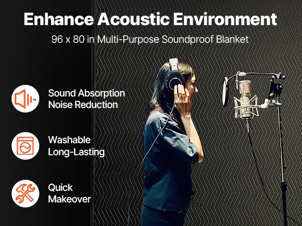 This soundproof blanket can be hung on walls or ceilings to reduce sound reflections, making recordings in music studios and home streaming rooms clearer by minimizing reverb.