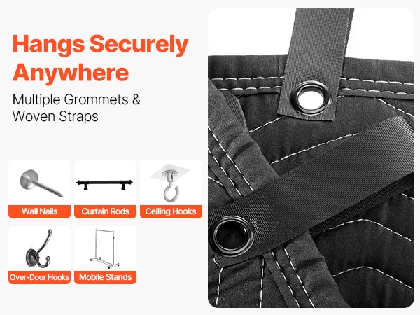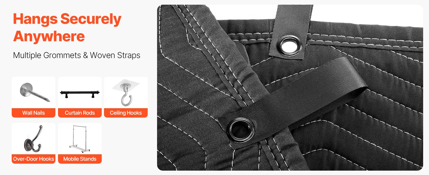 Easy Installation: Equipped with multiple metal grommets and woven straps, the acoustic blankets can be hung with hooks, screws, or curtain rods. Quick to set up and secure, it works as a flexible soundproof, blackout, or insulation barrier on walls, doors, and windows.