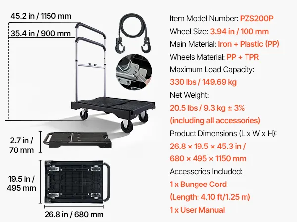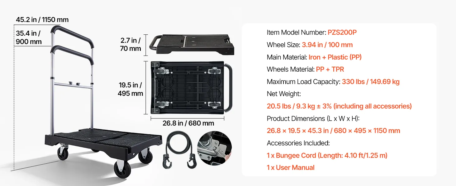 Comfortable Grip, Easy Handling: The soft rubber-foam handle (0.87 in / 22 mm Dia) ensures a secure, fatigue-free grip. Includes a 4.1 ft (1.25 m) bungee cord and anti-slip PP platform, this flat bed cart with wheels secures cargo and avoids slipping