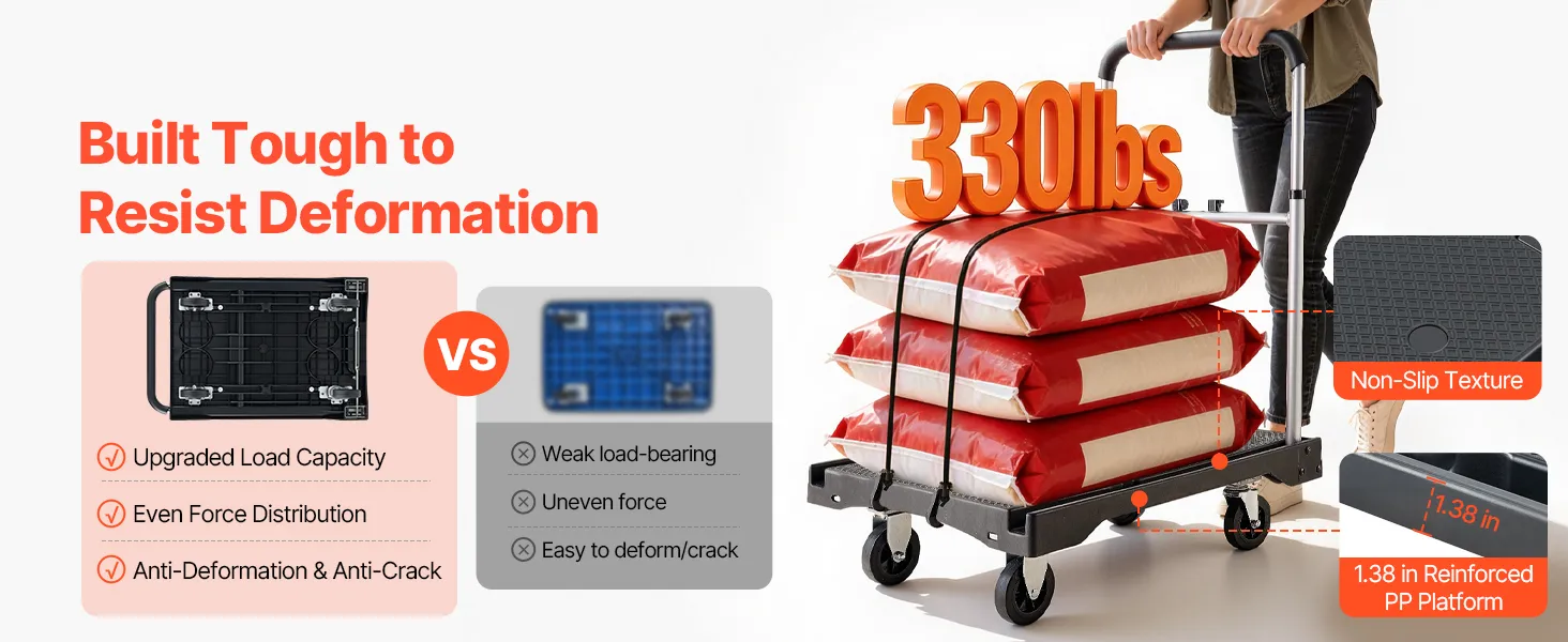 Stable Build, 330 lbs Load Capacity: Built with an iron and PP frame and a 4.4 mm thick PP platform, this folding platform truck resists bending. It supports up to 330 lbs (149.7 kg), helping you move heavy items with confidence and lasting durability
