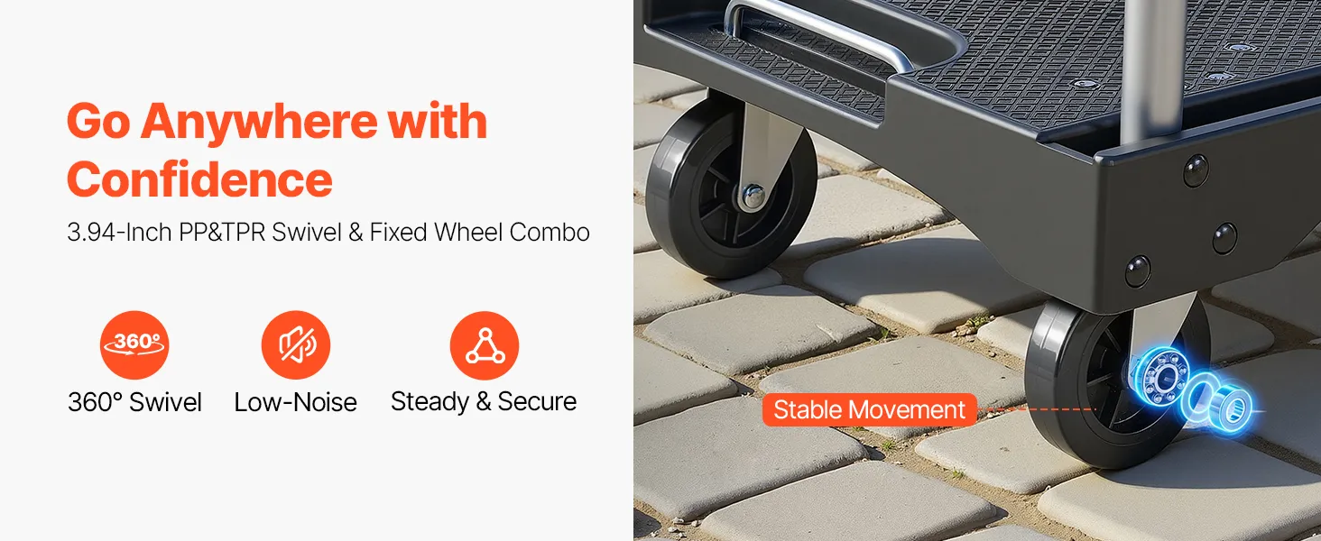 PP+TPR Wheels, Smooth Rolling: Equipped with 3.94 in(100 mm) PP+TPR swivel and fixed wheels, this foldable flatbed cart delivers 360° mobility and low-noise operation across uneven floors, narrow turns, and rugged surfaces