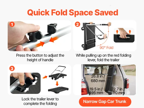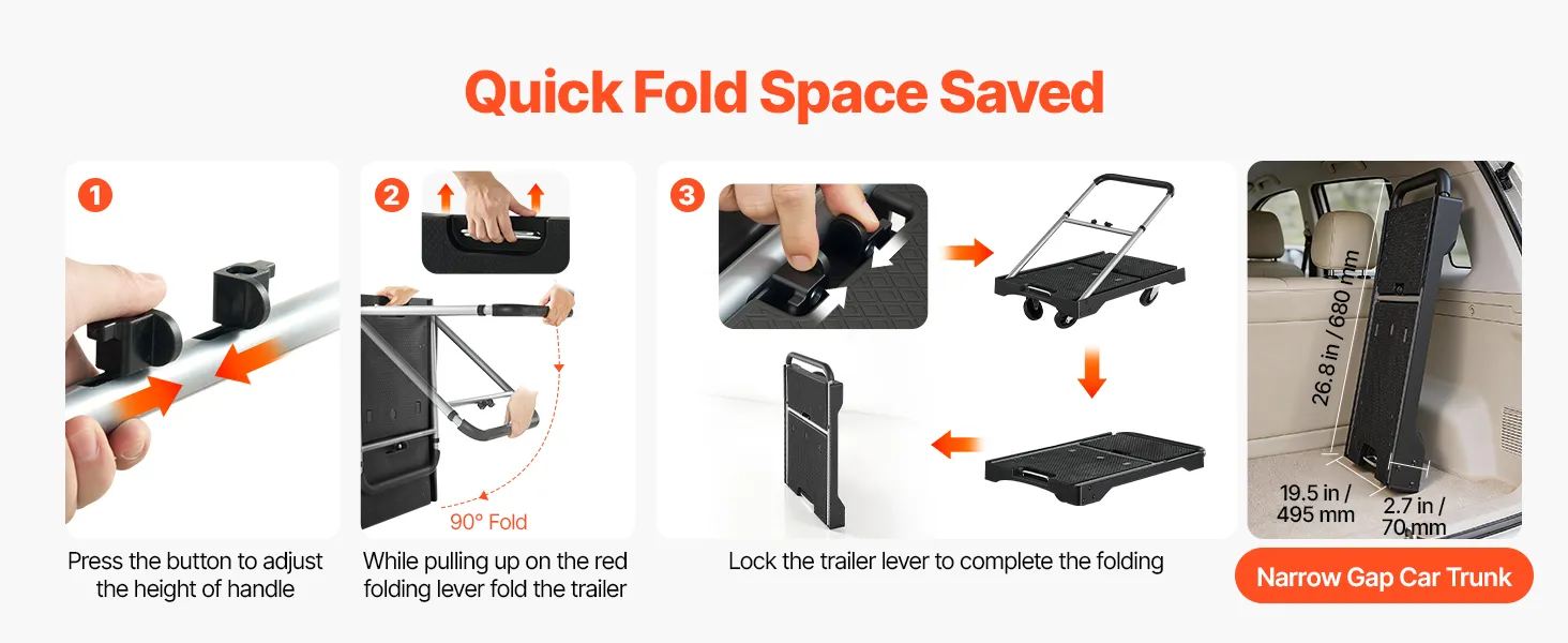 2-Level Adjustment, Quick Folding: This foldable push cart dolly features a 2-level adjustable handle for users of different heights. It folds down to 26.8 x 19.5 x 1.4 in (680 x 495 x 35 mm), fitting car trunks and tight storage spaces