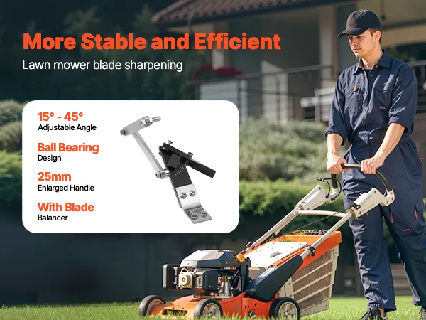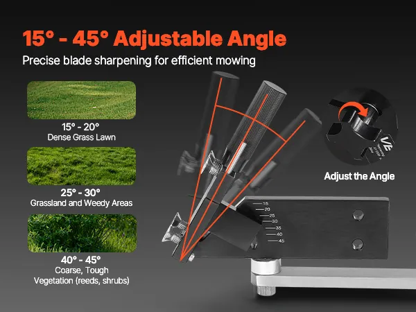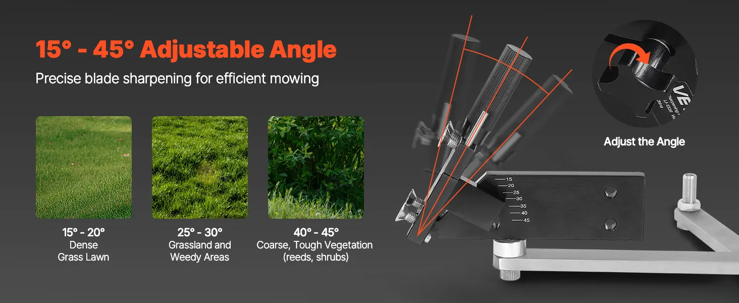 • 15° - 45° Adjustable Angle: The adjustment knob and clear angle scale allow you to easily set the sharpening angle from 15° to 45°, achieving precise blade sharpening with customizable angles for optimal mowing performance